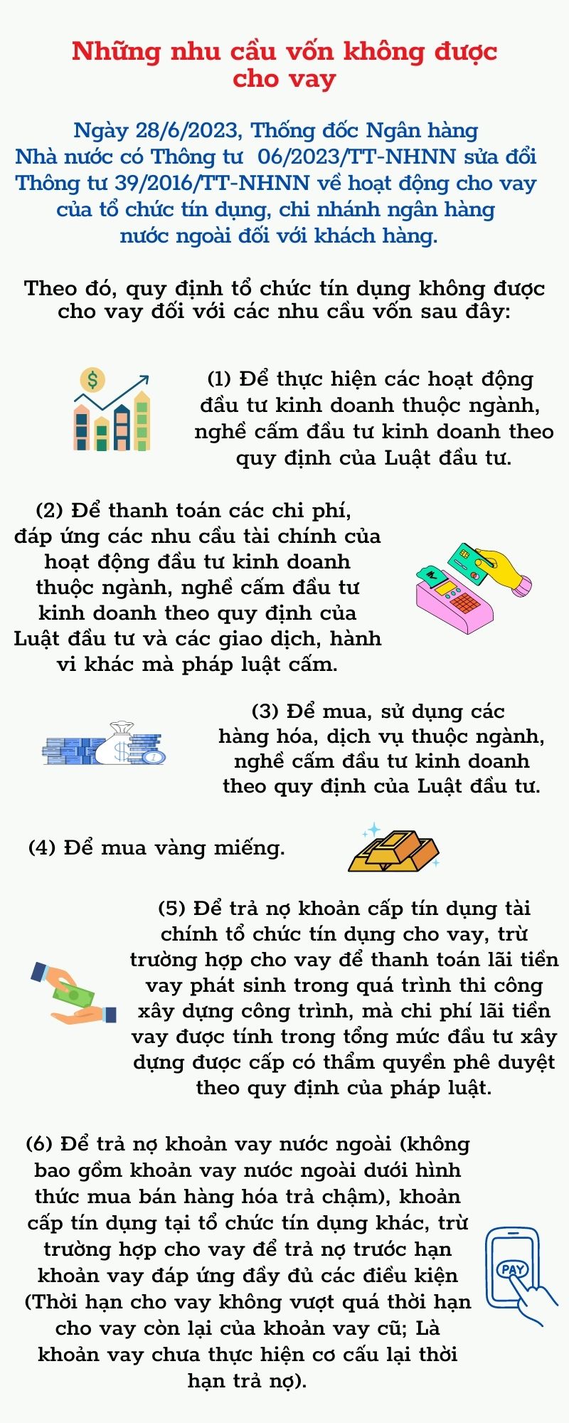 Thông tư 06/2023 sửa Thông tư 39/2016 về cho vay của tổ chức tín dụng. Thông tư bãi bỏ quy định về đảo nợ và quy định rõ các nhu cầu vốn không được cho vay, nhằm siết chất lượng tín dụng. Cho vay bù đắp tài chính là vay để bù các chi phí đã trả.