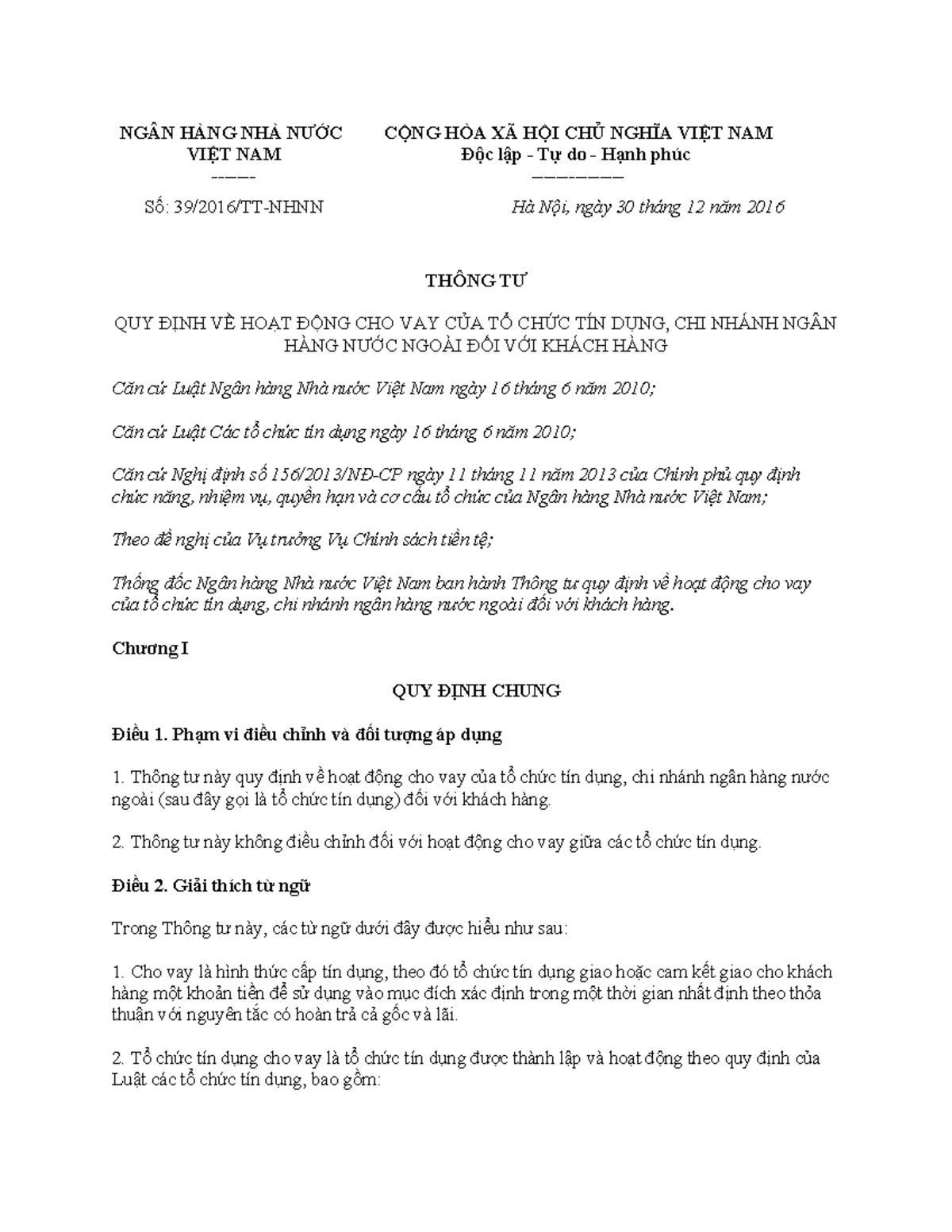 Thông tư 39/2016/TT-NHNN do Thống đốc Ngân hàng Nhà nước ban hành ngày 30/12/2016 (có hiệu lực từ 15/3/2017) quy định về hoạt động cho vay của tổ chức tín dụng và chi nhánh ngân hàng nước ngoài. Văn bản này đặt nền tảng cho quản lý rủi ro tín dụng và minh bạch trong hoạt động cho vay.