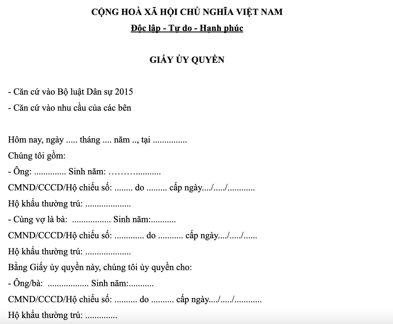 Trong mẫu thường có phần khai thông tin cá nhân (họ tên, năm sinh, số CMND/CCCD, ngày cấp, nơi cấp), phần kính gửi tới NHCSXH và phần ký xác nhận của bên ủy quyền, bên được ủy quyền. Mẫu này rất tiện lợi, rõ ràng và giúp bảo đảm quyền lợi khi gia đình mình không thể trực tiếp làm việc với ngân hàng.