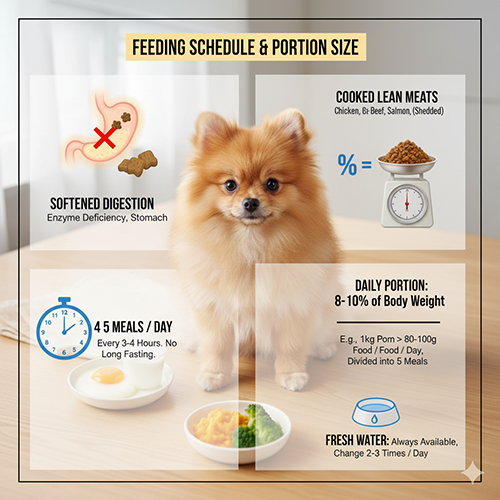 Bạn nên cho cún ăn 4-5 bữa mỗi ngày, mỗi bữa khoảng 60-80 gram. Các món chính là cháo loãng nấu từ nước hầm xương, trộn rau củ xay nhuyễn như bí đỏ, cà rốt, bắp cải. Thêm thịt bò, gà hoặc heo băm nhỏ để cung cấp protein, giúp bé khỏe mạnh và lông mượt.