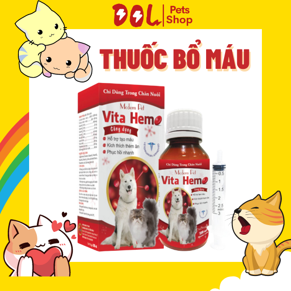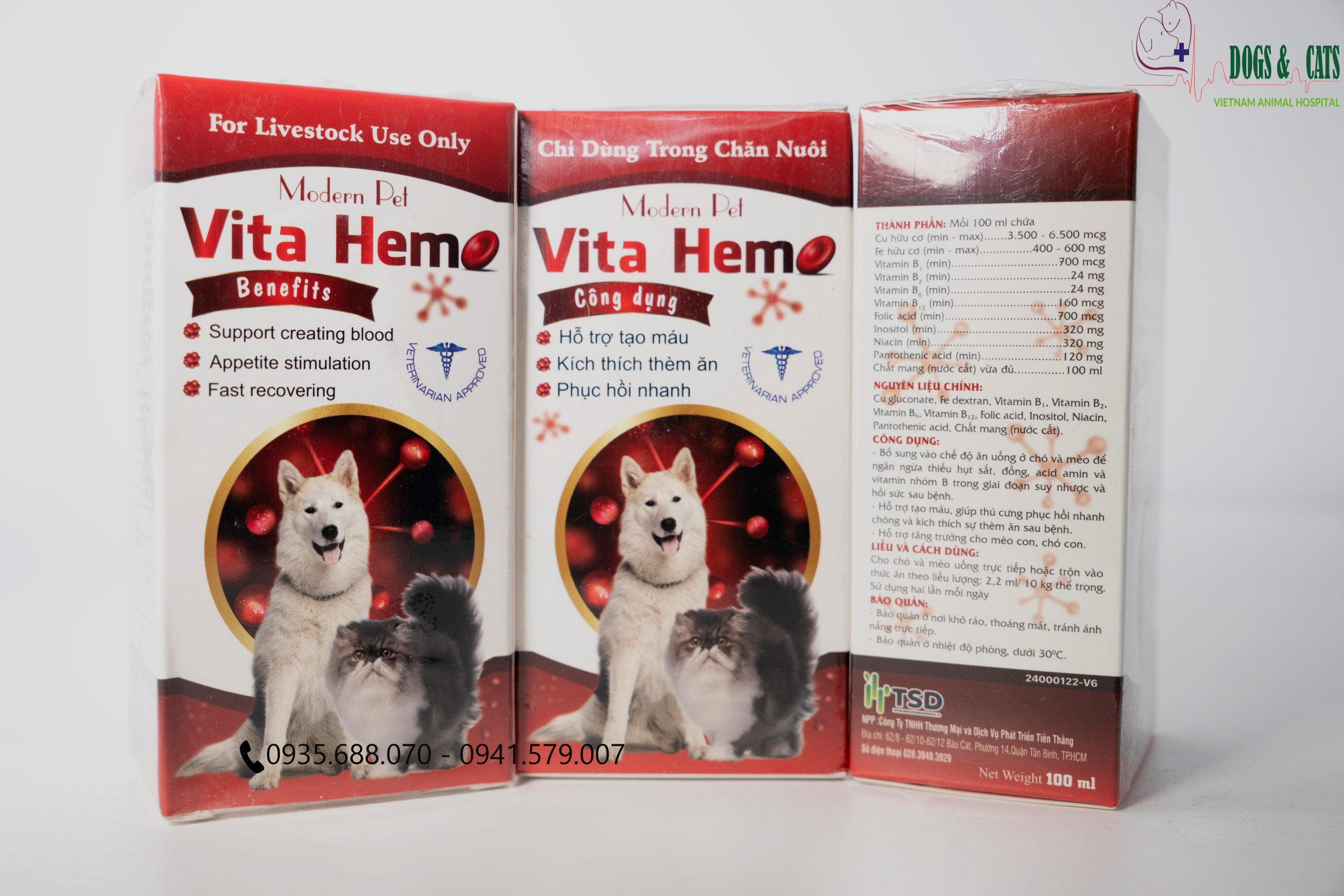 Tiếp theo, ưu tiên sản phẩm chứa sắt hữu cơ (Fe), vitamin B-complex, folic acid và đồng như Vita Hemo – loại siro an toàn cho cả chó mèo, liều 2,2ml/10kg cân nặng, uống 2 lần/ngày. Có thể trộn vào thức ăn để bé dễ nuốt.