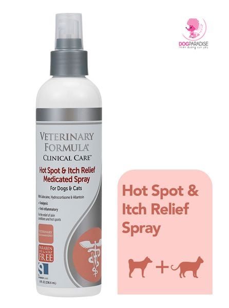 Hoặc Veterinary Formular Hot Spot với Hydrocortisone và Lidocain, xịt 2 lần/ngày để đẩy lùi mẩn đỏ, vết thương nhanh chóng.