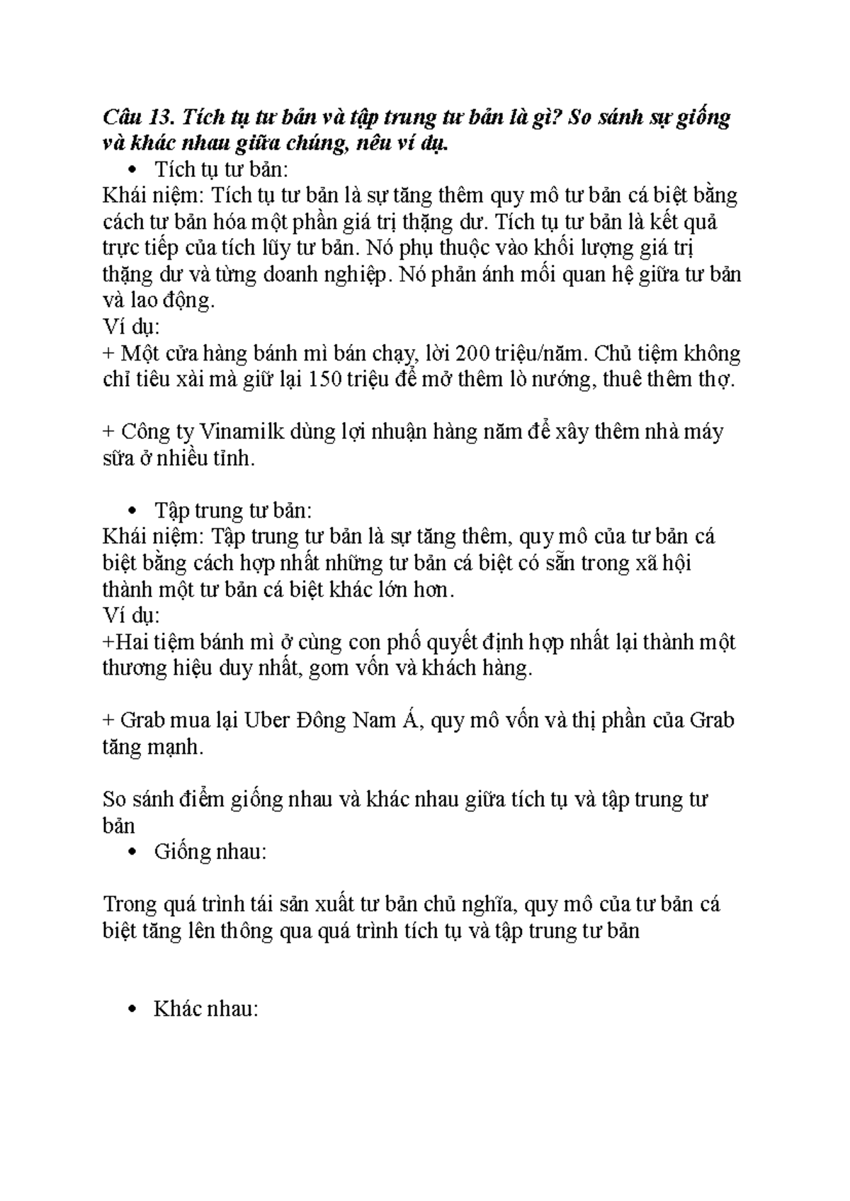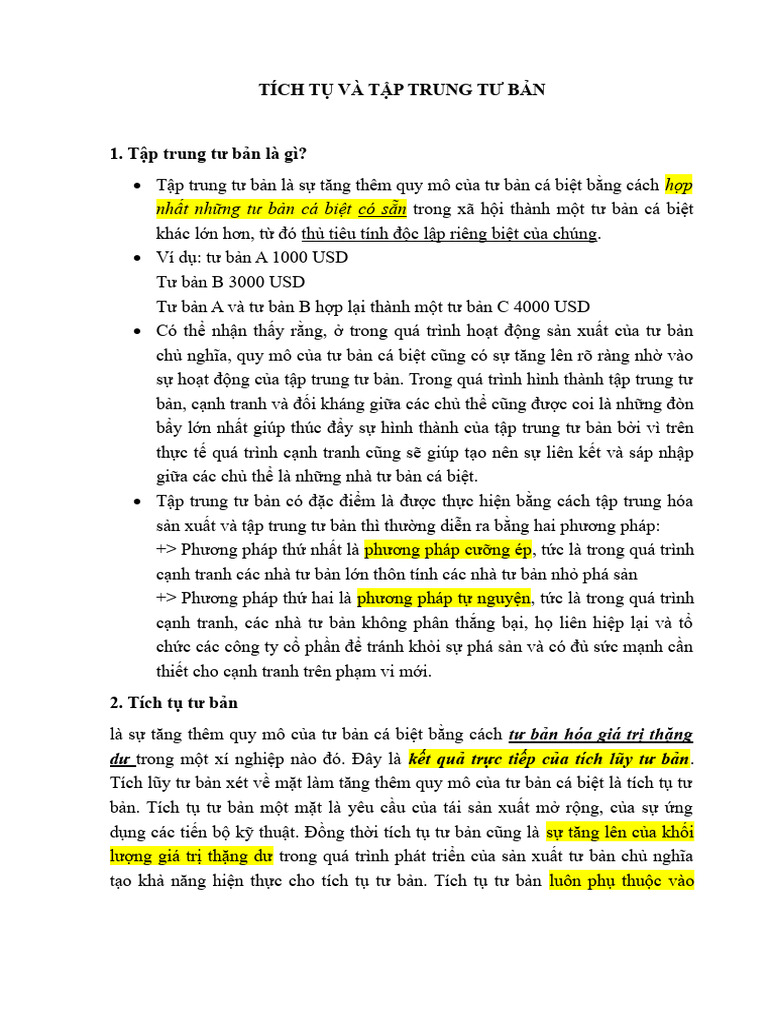 Tập trung tư bản là quá trình gom nhiều tư bản về một mối thông qua mua bán, sáp nhập hoặc liên doanh. Ví dụ, một công ty lớn mua lại vài doanh nghiệp nhỏ, khiến vốn, phương tiện sản xuất và quyền quyết định tập trung vào tay số ít, thay đổi cơ cấu cạnh tranh trên thị trường.