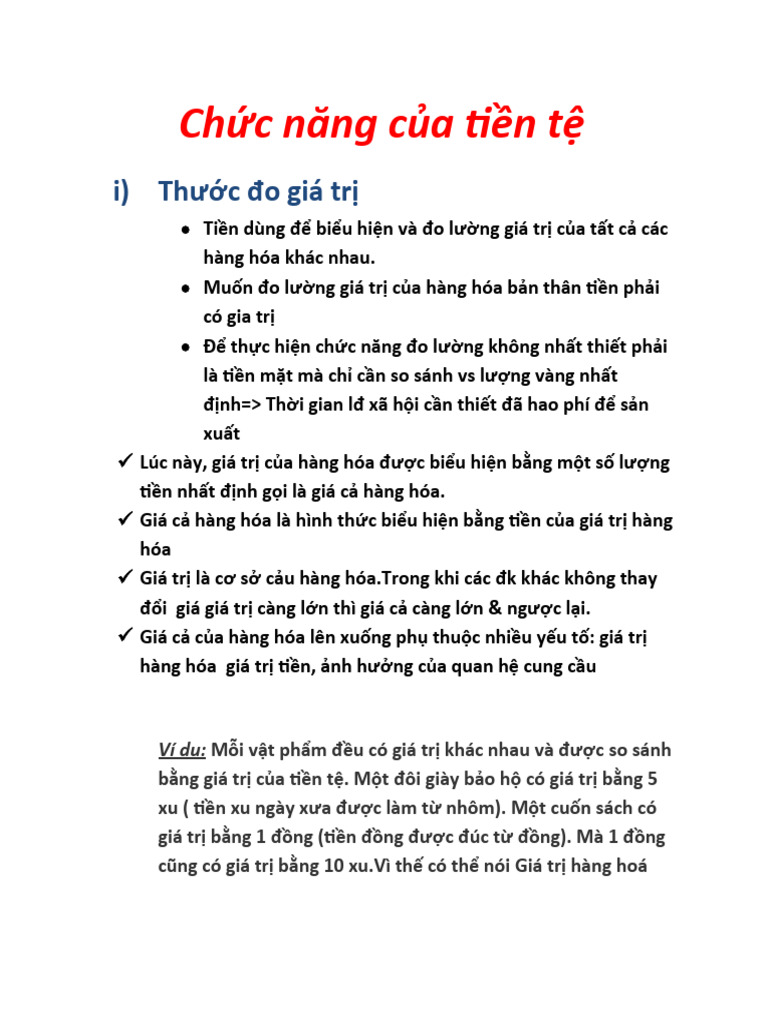 Đầu tiên, tiền là phương tiện trao đổi, giúp mua bán hàng hóa và dịch vụ thuận tiện hơn so với hàng đổi hàng. Thứ hai, tiền là thước đo giá trị, làm tiêu chuẩn để so sánh, định giá các sản phẩm khác nhau trong nền kinh tế.