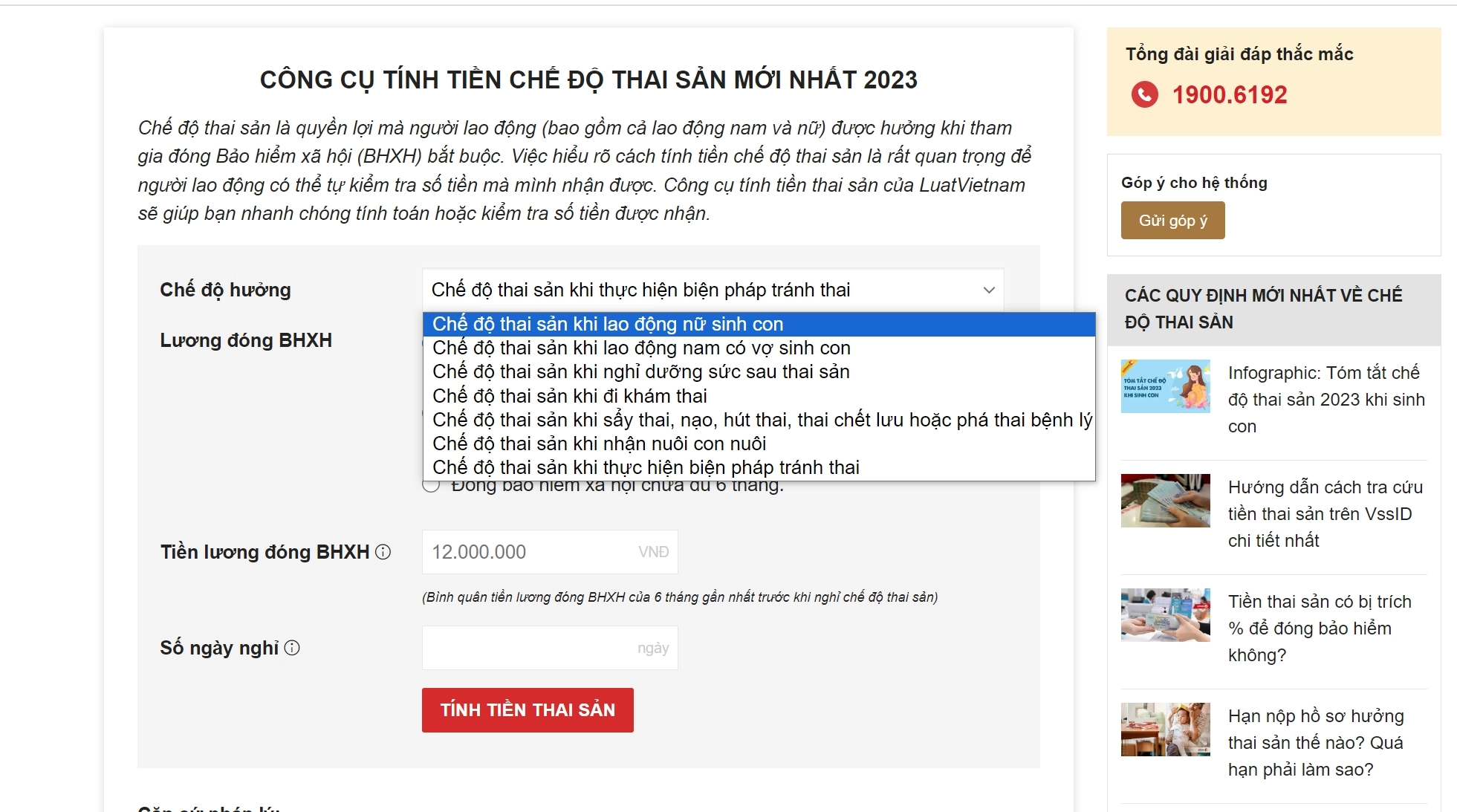 Nếu bạn là lao động nữ hoặc có vợ đang mang thai, việc nắm rõ chế độ thai sản rất quan trọng. Để hỗ trợ người lao động, LuatVietnam đã phát triển Công cụ tính tiền chế độ thai sản online, với hướng dẫn cụ thể và dễ sử dụng. Không chỉ dành cho phụ nữ sinh con, công cụ này cũng áp dụng cho trường hợp nhận con nuôi hoặc phá thai.
