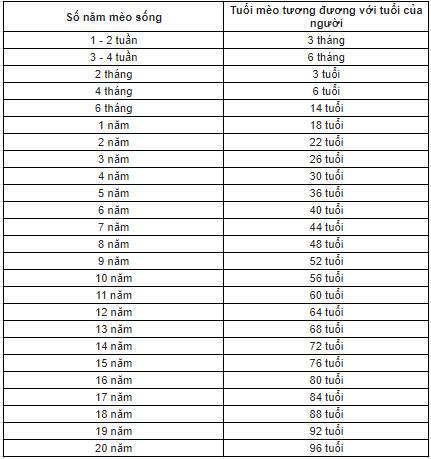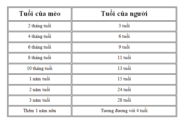Năm thứ hai, chúng nhảy vọt lên khoảng 24 tuổi người, rồi từ năm thứ ba trở đi, cứ mỗi năm mèo cộng thêm 4 tuổi người. Ví dụ, mèo 6 tháng tuổi bằng chừng 9-14 tuổi thiếu niên, lúc này chúng đã nghịch ngợm và độc lập lắm rồi. Còn mèo 5 tuổi thì ngang 36 tuổi người, bước vào tuổi trung niên.