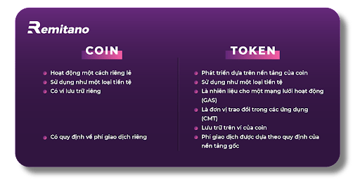 Token và Coin đều là các loại tài sản kỹ thuật số trong thế giới tiền điện tử, nhưng chúng có những điểm khác biệt quan trọng. Coin là đồng tiền kỹ thuật số tồn tại trên nền tảng blockchain riêng biệt của nó, ví dụ như Bitcoin (BTC) trên blockchain Bitcoin hay Ether (ETH) trên blockchain Ethereum. Coin thường được dùng như một dạng tiền tệ để thanh toán, lưu trữ giá trị và thực hiện các giao dịch trên mạng lưới blockchain đó.