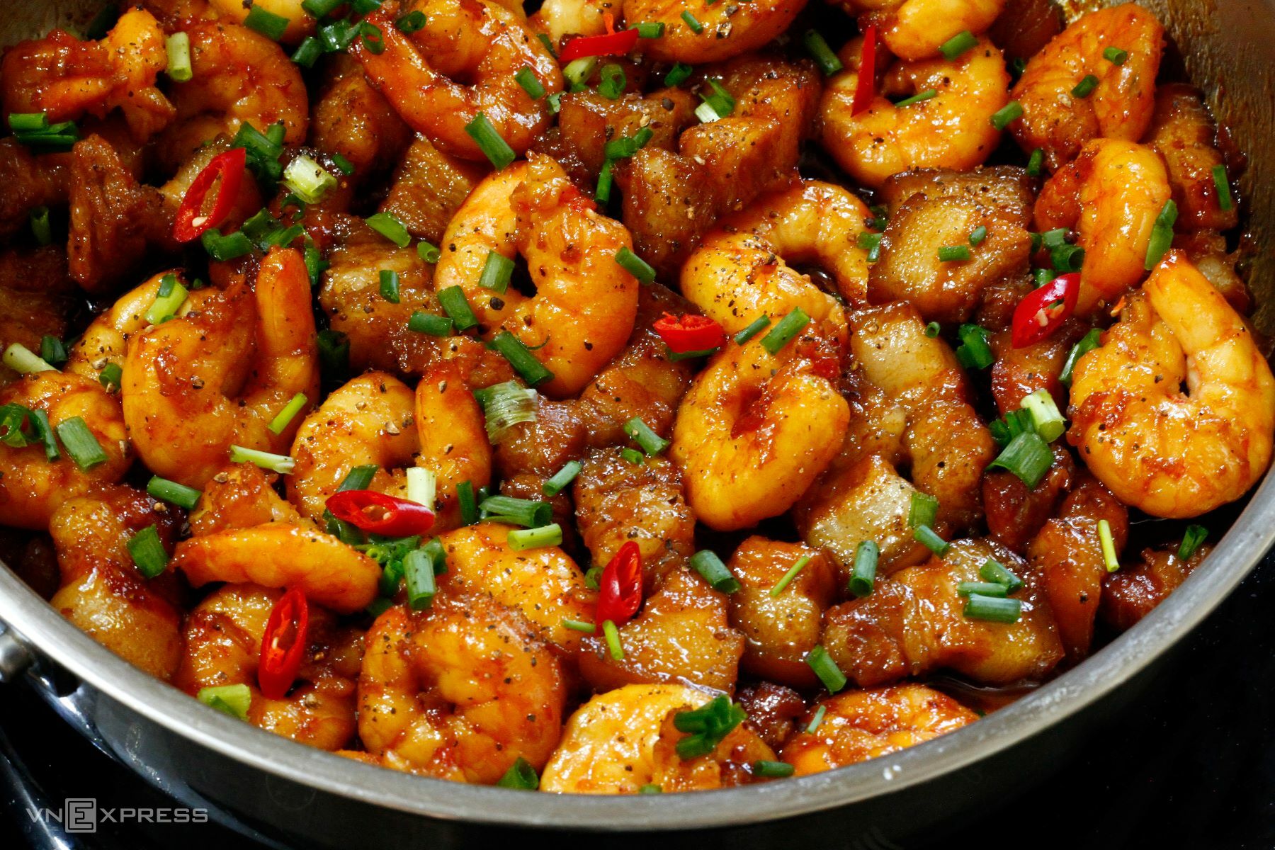 Công đoạn chế biến rất dễ dàng. Đầu tiên, bạn ướp tôm và thịt ba chỉ với gia vị trong khoảng 15 phút. Sau đó, cho hành khô và tỏi xào thơm rồi cho phần tôm và thịt vào chảo. Đảo đều và nêm nếm cho vừa ăn. Món ăn sẽ càng ngon hơn khi được nấu chín cùng với một chút hành lá và ớt tươi để tăng thêm vẻ hấp dẫn.