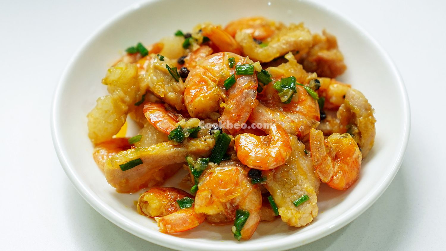 Khi tôm đã có màu cam đỏ đẹp mắt, cùng hương thơm quyến rũ, bạn có thể rắc thêm hành lá và chút tiêu xay lên trên. Món Tôm Rang Thịt Ba Chỉ không chỉ bắt mắt mà còn mang đến hương vị ngọt ngào từ tôm, béo ngậy từ thịt, khiến ai cũng phải xuýt xoa và không thể cưỡng lại!