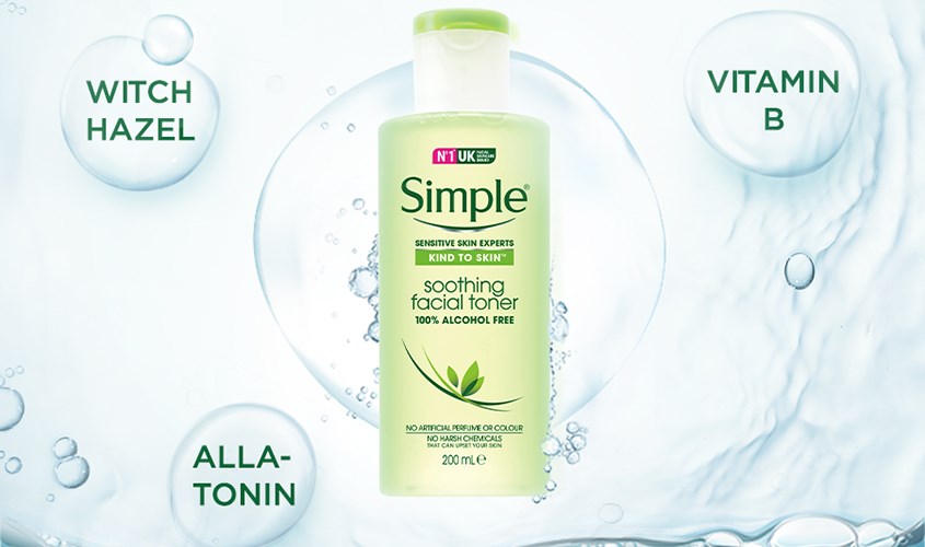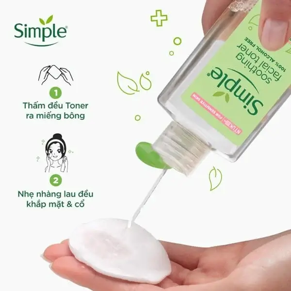 Sau khi da đã sạch, thấm một lượng vừa đủ toner Simple vào miếng bông tẩy trang. Bạn có thể lau nhẹ nhàng khắp mặt và cổ, nhớ đi theo chiều từ trong ra ngoài và từ dưới lên trên để giúp da tránh hình thành nếp nhăn. Nếu bạn muốn, cũng có thể dùng lòng bàn tay để thoa toner trực tiếp, massage nhẹ nhàng để sản phẩm thấm sâu vào da.