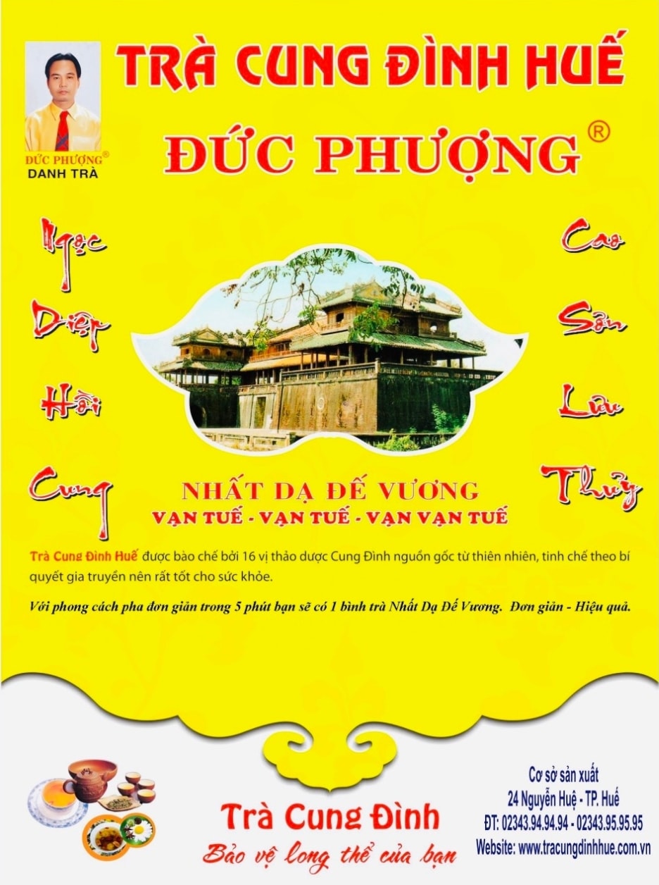Trà Cung Đình Đức Phượng, một đặc sản nổi bật của Thành phố Huế, tọa lạc tại số 24 Nguyễn Huệ, Phường Vĩnh Ninh. Với ba hotline phục vụ khách hàng là 02343.94.94.94, 02343.95.95.95 và 0942.94.94.94, trà cung đình này không chỉ thu hút người yêu trà mà còn đáp ứng tốt nhu cầu chăm sóc sức khỏe.