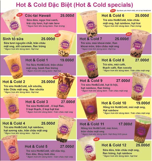 Menu phong phú với nhiều món chỉ có giá 10.000đ/ly khiến ai cũng hài lòng. Không chỉ có trà sữa Hot Cold, mà còn nhiều loại khác như trà sữa Double Tea, đều mang đến hương vị tươi ngon, đầy màu sắc. Không gian quán tuy có lúc đông đúc nhưng luôn ngập tràn sự vui vẻ, nhờ vào sự phục vụ nhiệt tình, dễ thương của nhân viên.