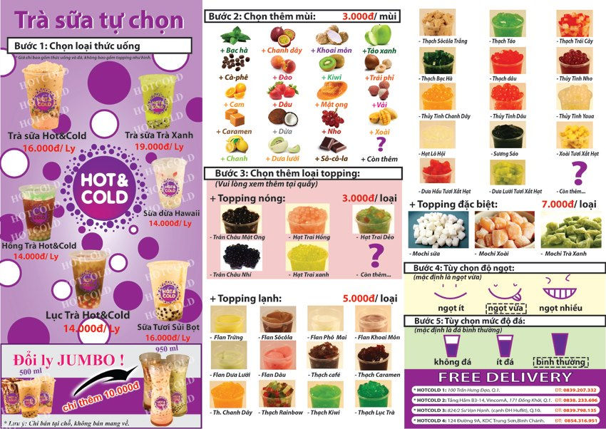 Nếu bạn không có thời gian ghé quán, dịch vụ giao hàng của Hot & Cold cũng rất tiện lợi. Chỉ với hóa đơn trên 100.000đ và trong bán kính 3km, bạn có thể nhanh chóng thưởng thức trà sữa yêu thích tại nhà. Phí giao hàng tối thiểu là 15.000đ, và sẽ thay đổi tùy theo từng thời điểm giao hàng, thật sự không quá đắt đỏ.