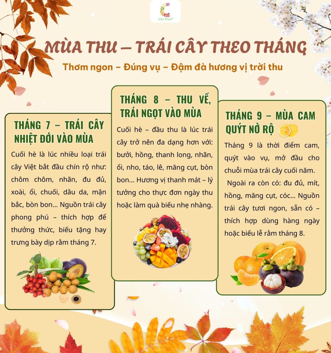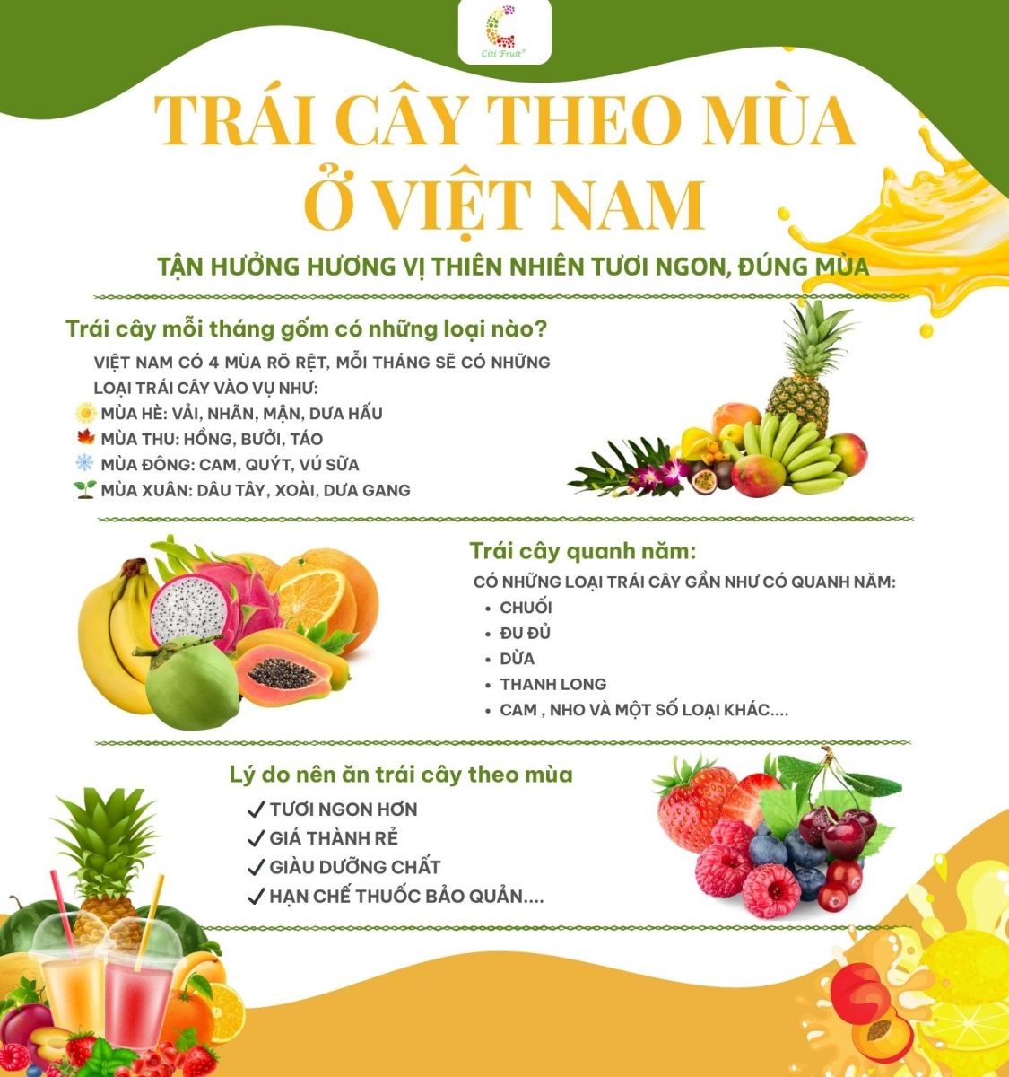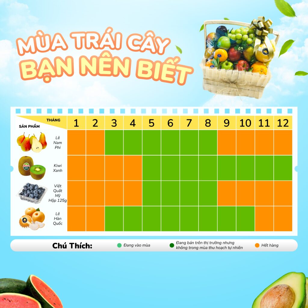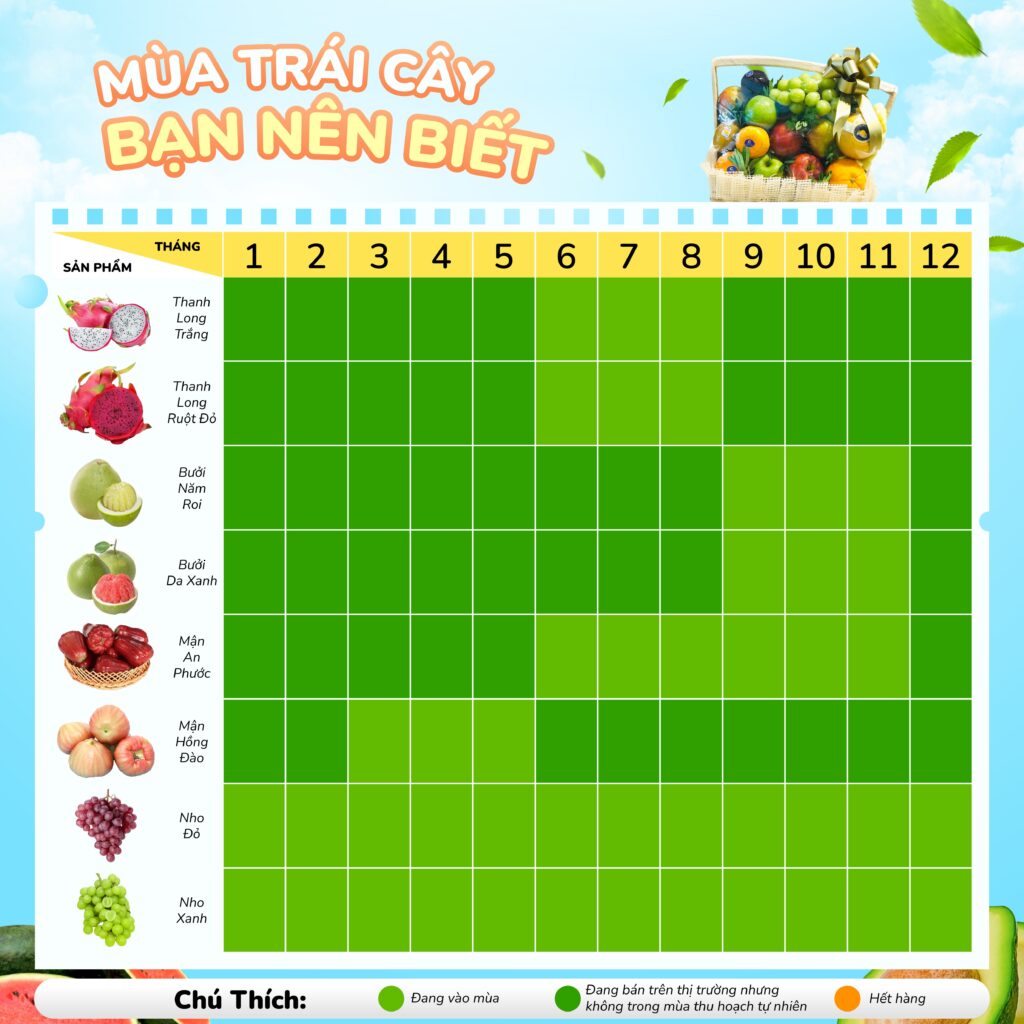 Việt Nam là đất nước nhiệt đới với khí hậu đa dạng, nhờ vậy mà mỗi vùng miền lại có những loại trái cây theo mùa riêng biệt, thơm ngon và hấp dẫn. Việc lựa chọn, thưởng thức trái cây vào đúng mùa không chỉ giúp tận hưởng hương vị trọn vẹn mà còn mang lại nhiều lợi ích cho sức khỏe. Bài viết dưới đây sẽ giúp bạn khám phá các loại trái cây theo mùa ở từng miền Bắc, Trung, Nam cũng như các lưu ý khi lựa chọn, bảo quản và cách mua trái cây theo mùa ngon, an toàn nhất.
