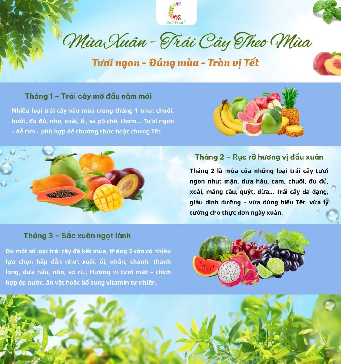 Tháng giêng, bưởi, chuối, và nho chính là những lựa chọn tuyệt vời cho bữa ăn đầu năm. Ngoài ra, quanh năm cũng có những trái cây như chuối, bơ, ổi hay thanh long. Đặc biệt, vào tháng 7, chôm chôm, mít, và đu đủ xuất hiện không thể thiếu trên mâm trái cây. Mỗi mùa đều có nét đẹp riêng, mang đến cho chúng ta những trải nghiệm thú vị từ thiên nhiên.