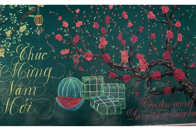 Để bảng thêm phần thu hút, bạn có thể vẽ những hình ảnh bằng phấn như chữ “Phúc”, “Lộc”, “Thọ” và đèn lồng. Những ý tưởng sáng tạo như treo vòng hoa, xếp hình bao lì xì hoặc vẽ hoa đào trên bảng cũng sẽ biến lớp học thành nơi tràn ngập không khí Tết. Khoảng không gian nhỏ sẽ trở nên rực rỡ và hấp dẫn hơn.