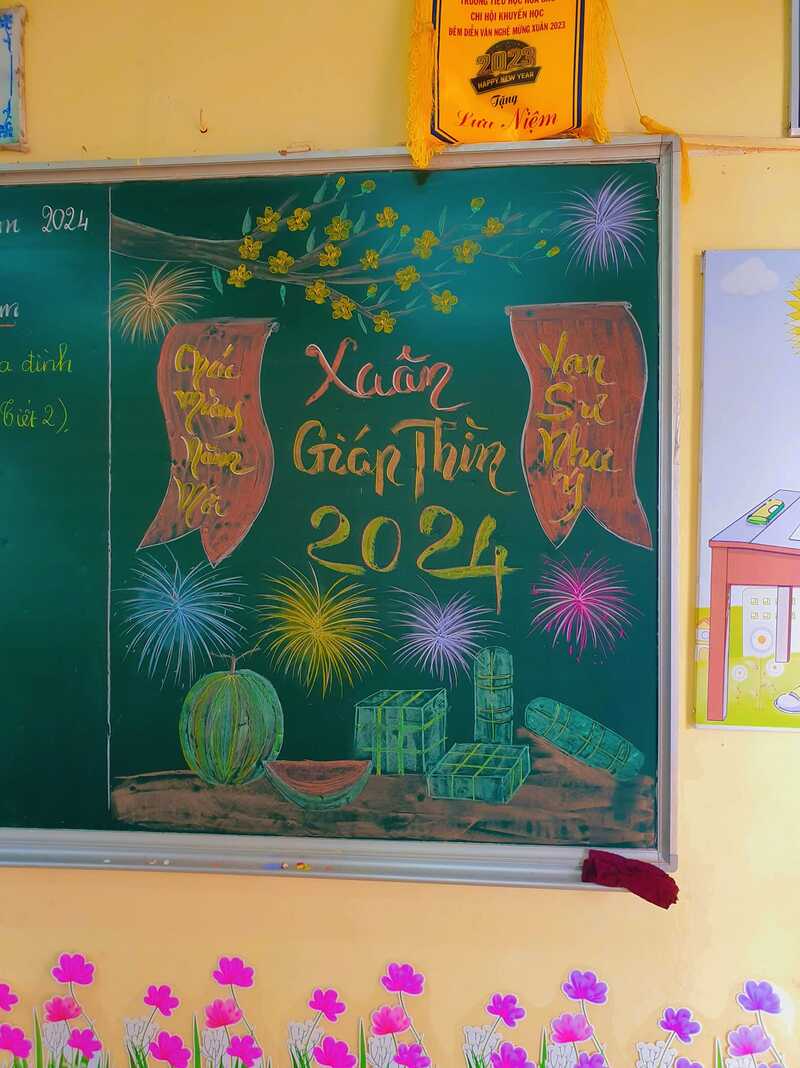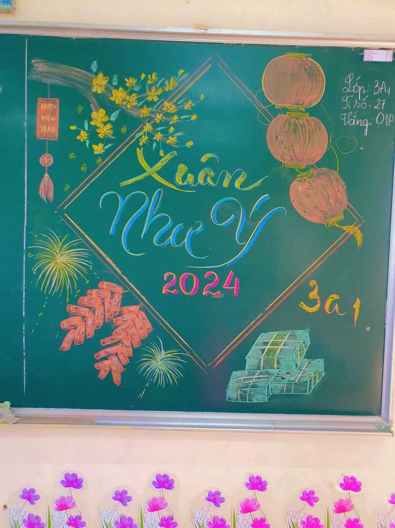Tết Nguyên Đán là một dịp lễ quan trọng trong năm, và việc trang trí lớp học trước thềm năm mới giúp tạo không khí vui tươi, rộn ràng hơn cho học sinh. Để lớp học thêm phần sinh động, các bạn học sinh có thể cùng nhau trang trí bảng với những hình ảnh và biểu tượng đặc trưng của ngày Tết như cây đào, cây mai, câu đối đỏ và bao lì xì. Việc vẽ những hình ảnh này bằng phấn sẽ tạo nên điểm nhấn nổi bật cho không gian học tập.