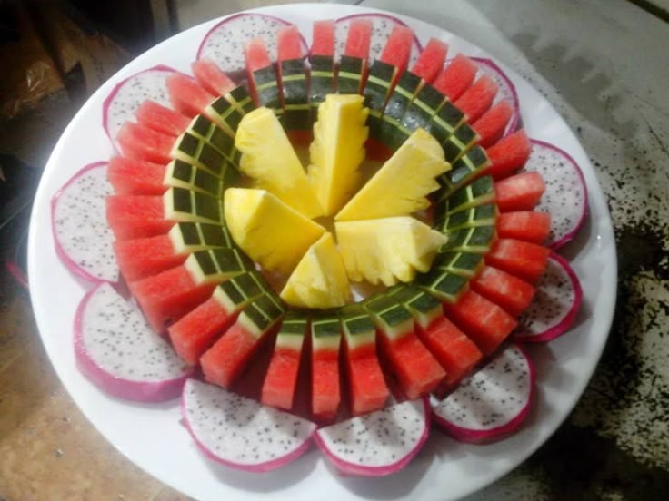 Để dĩa trái cây thêm phần sinh động, việc kết hợp với lá cây non và hoa tươi là lựa chọn tuyệt vời. Hãy sử dụng vỏ dưa hấu để tạo thành những họa tiết ấn tượng, sau đó đặt các loại trái cây tươi ngon xung quanh. Đừng quên chọn những loại trái cây màu sắc hài hòa để tạo sự thu hút cho thực khách.