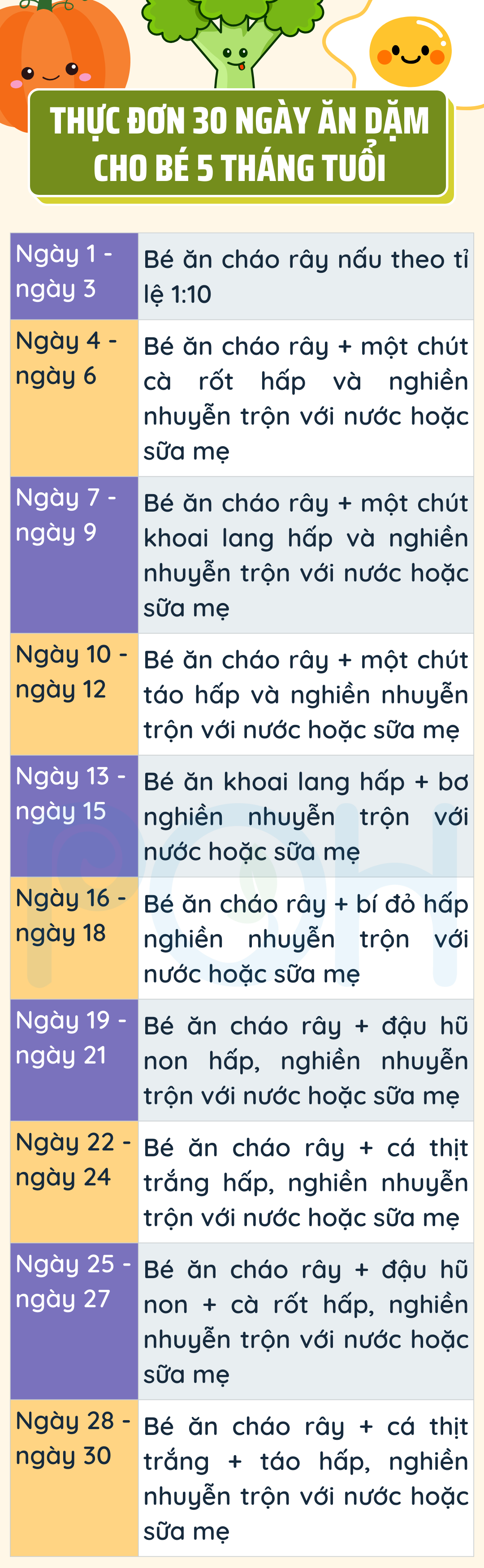 Trong tuần đầu tiên, có thể lựa chọn các món như bí đỏ và cà rốt hấp vào ngày đầu tiên, sau đó là khoai lang, su su, khoai tây… Mỗi bữa ăn đều cần kết hợp thêm bú sữa mẹ hoặc sữa công thức để đảm bảo dinh dưỡng cho bé. Chúc mẹ và bé sẽ có những trải nghiệm ăn dặm thật vui vẻ!