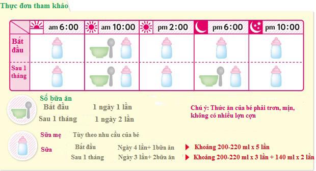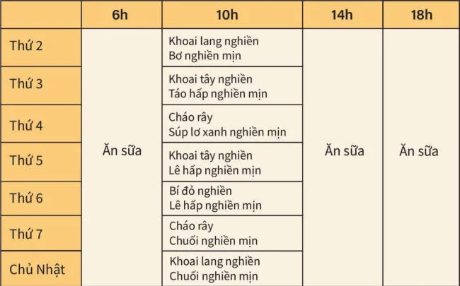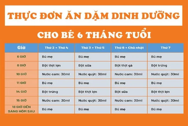 Khi bé được 6 tháng tuổi, đây là thời điểm lý tưởng để bắt đầu chế độ ăn dặm. Mẹ nên cho bé ăn 1 bữa/ngày, tốt nhất là vào buổi sáng hoặc buổi trưa. Lượng thức ăn mỗi bữa khoảng từ 100 đến 200ml, kết hợp với việc bú sữa mẹ. Mẹ hãy trải nghiệm để xem bé có thích ứng tốt với thức ăn mới hay không.