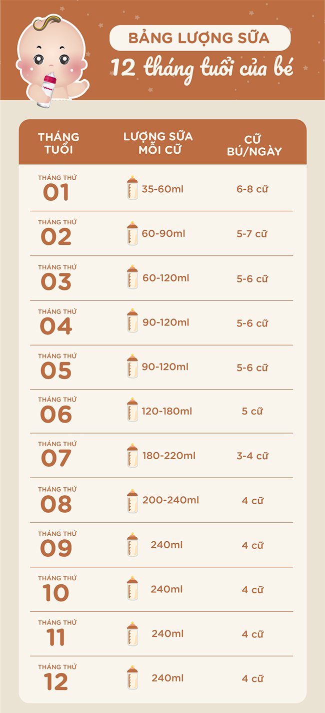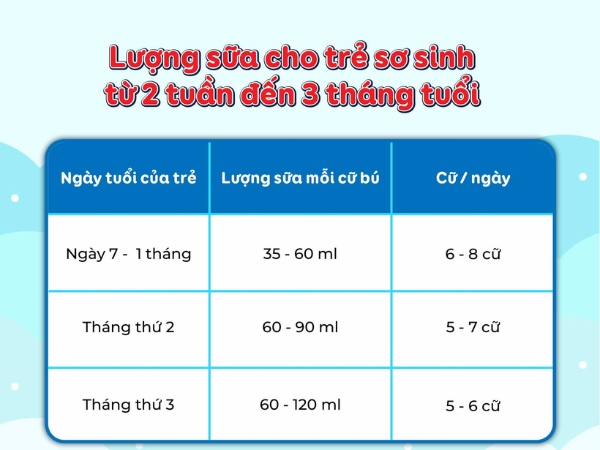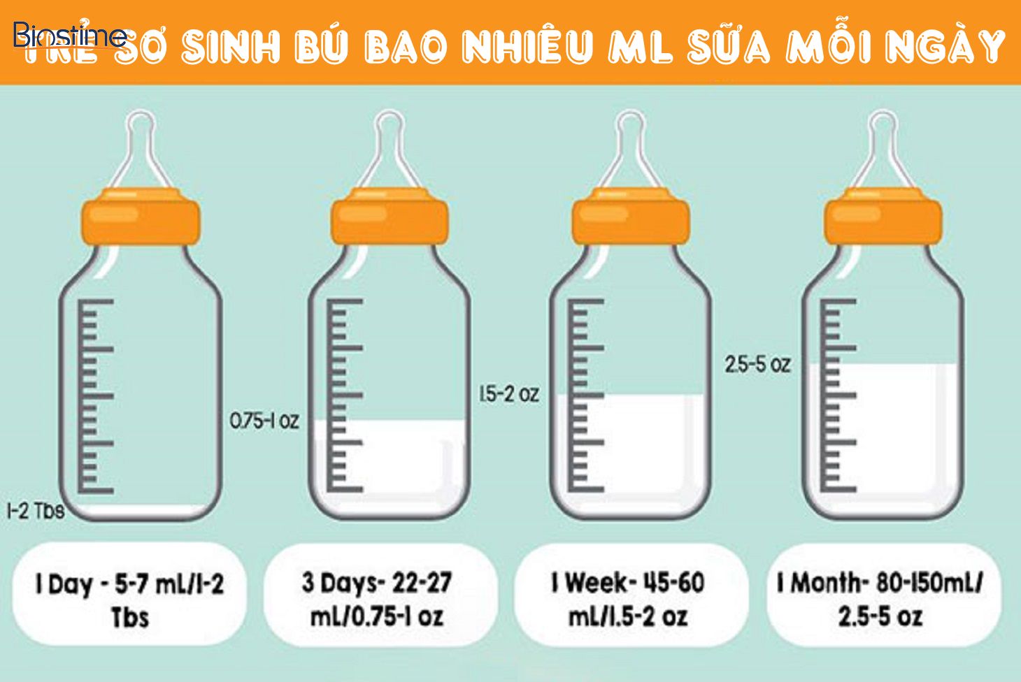 Khi nuôi dưỡng một trẻ sơ sinh, việc nắm rõ lượng sữa cần thiết là rất quan trọng. Trong giai đoạn từ 0 đến 29 ngày tuổi, trẻ thường bú từ 8 đến 12 cữ mỗi ngày, mỗi cữ khoảng 45 đến 88 ml. Điều này có nghĩa là mỗi 2 giờ, bé sẽ cần ăn để đáp ứng nhu cầu phát triển của mình. Trong 24 giờ đầu tiên, trẻ chỉ bú được khoảng 5 đến 7 ml, nhưng ngay ngày thứ hai, lượng này đã có thể tăng lên từ 14 ml.