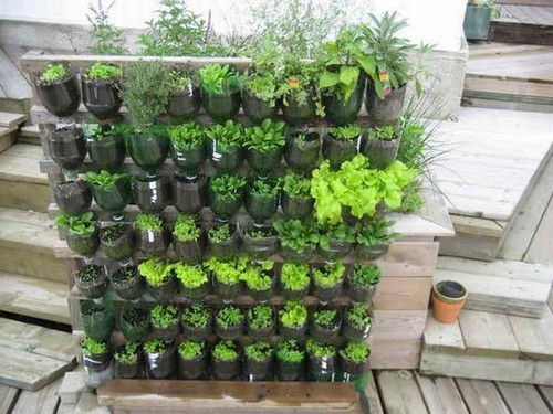Một trong những ý tưởng hay ho là kệ treo chai nhựa nối tiếp. Bằng cách cắt và treo từng chai, bạn có thể tạo ra những dãy rau xanh bắt mắt. Ngoài ra, hình kim tự tháp từ chai nhựa cũng rất tiện lợi, giúp tiết kiệm nước nhờ hệ thống tưới tự động từ trên xuống dưới.