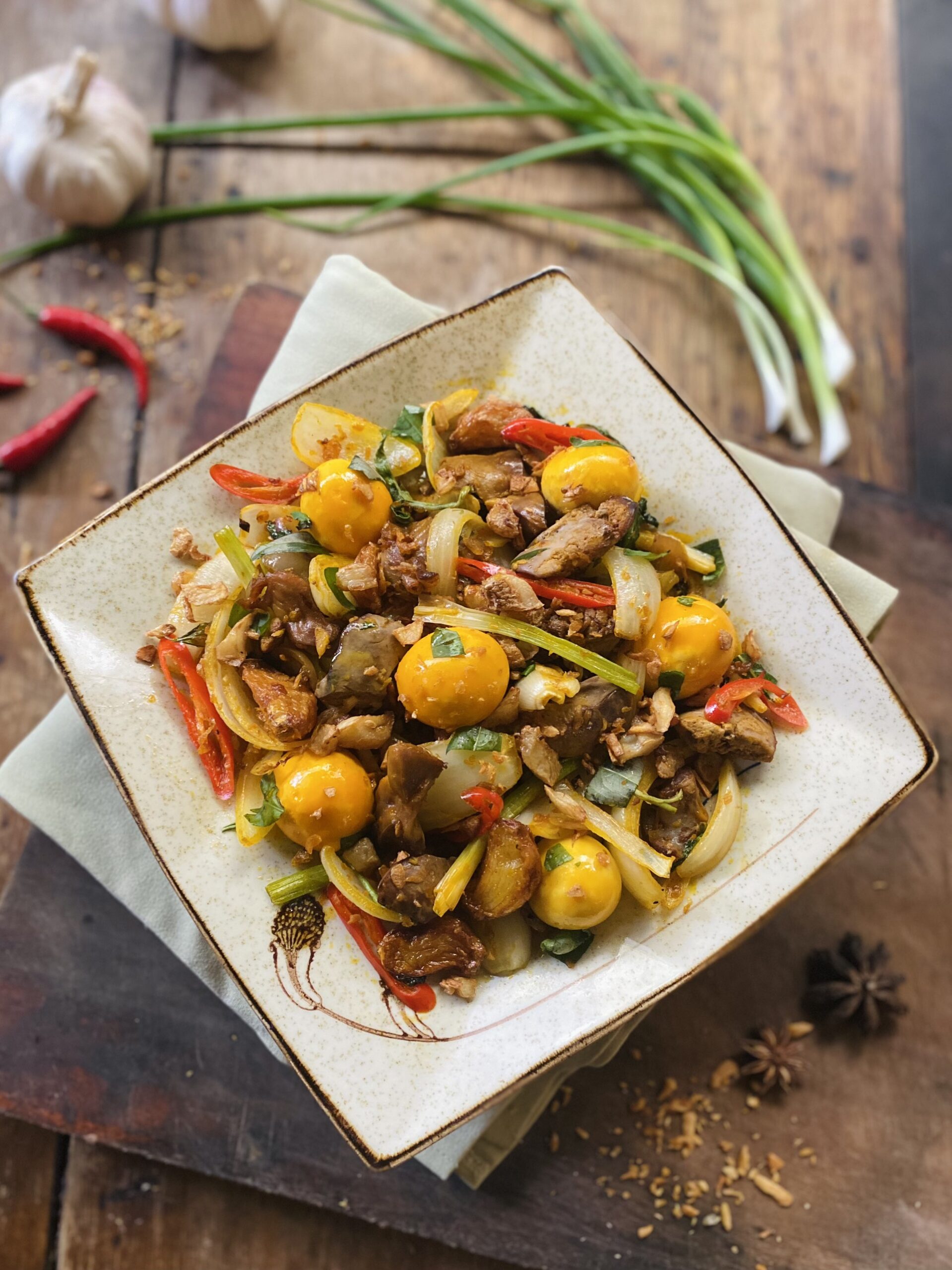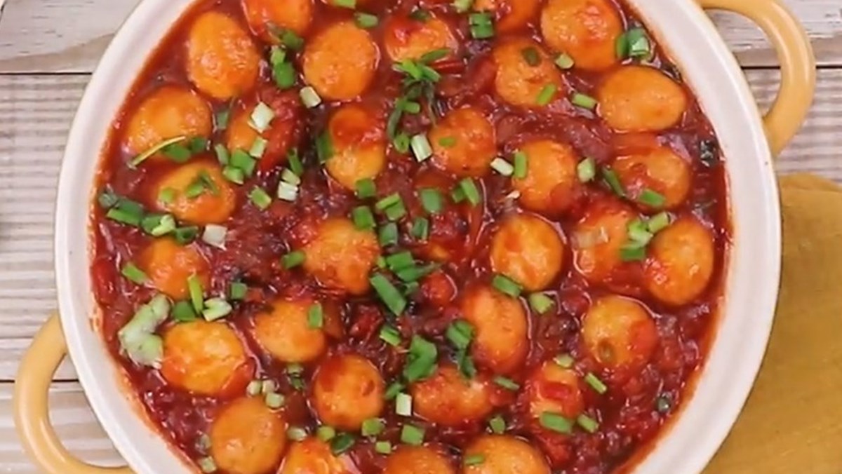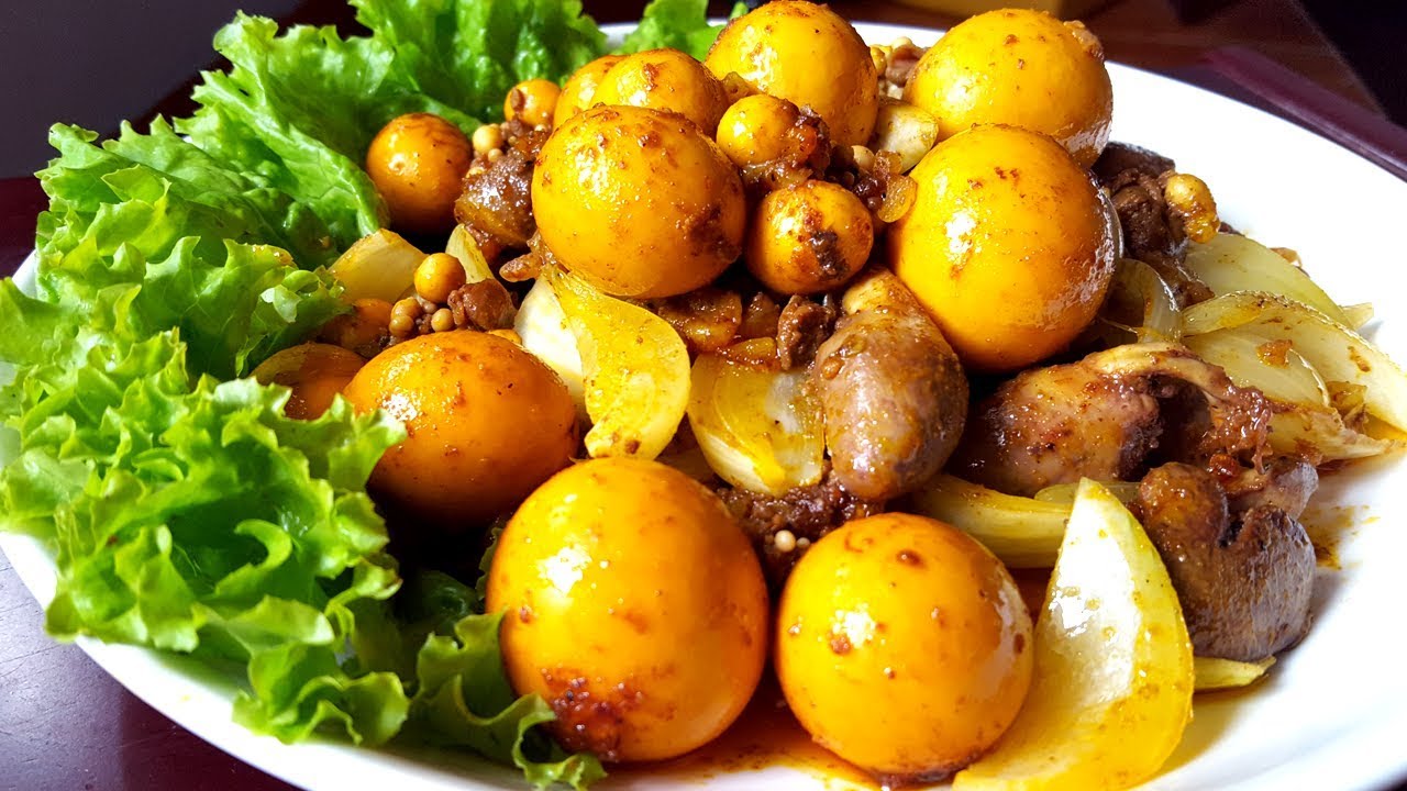 Khi hành tây đã vàng và dậy mùi, tiếp theo bạn cho trứng gà non đã được rửa sạch và ướp gia vị vào chảo. Đừng quên thêm vào khoảng 4-5 muỗng canh nước sốt đã pha sẵn, giúp món ăn thêm phần hấp dẫn. Nấu ở lửa vừa trong khoảng 15 phút cho đến khi trứng chín đều và ngấm gia vị.