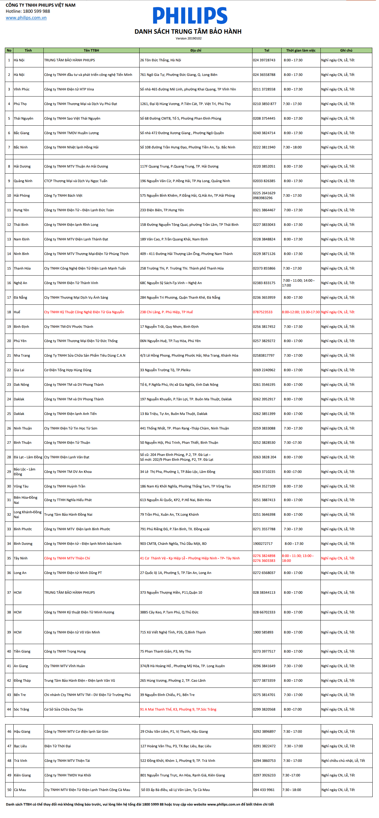 Đối với các sản phẩm vẫn còn trong thời gian bảo hành, trung tâm bảo hành Philips cam kết sẽ xử lý và hỗ trợ một cách nhanh chóng nhất. Hãy nhớ rằng, thời gian làm việc có thể thay đổi, vì vậy tốt nhất là kiểm tra thông tin trước khi tới.