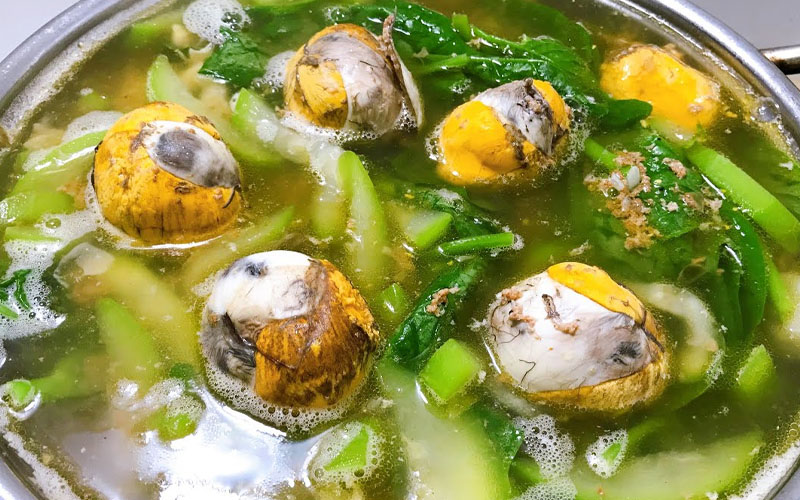 Khi nước sôi, thêm trứng vịt lộn và măng vào, đậy vung lại và om trong 20 phút cho tất cả các nguyên liệu hoà quyện với nhau. Món ăn sẽ trở nên hấp dẫn hơn khi thưởng thức cùng với nước chấm được pha chế từ tỏi, ớt và một vài gia vị khác.