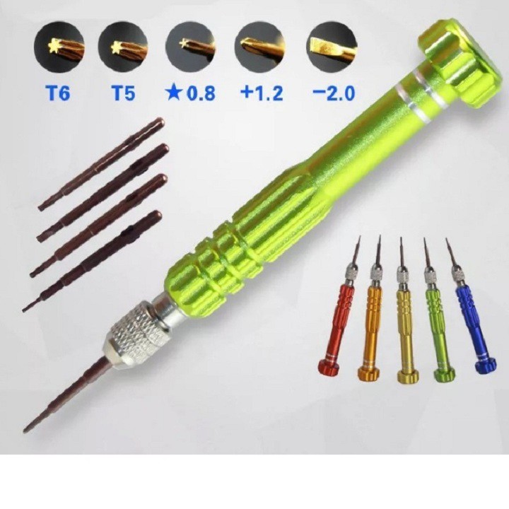 Bên trong bộ tua vít, bạn sẽ tìm thấy năm đầu vít đa dạng với kích thước khác nhau, như T4, T5, T6 và T7, rất phù hợp cho việc sửa chữa các loại điện thoại hoặc laptop. Để sử dụng, bạn chỉ cần đưa đầu tua vít vào lỗ ốc sao cho các cạnh khít chặt và chắc chắn. Đặc biệt, trước khi bắt đầu, hãy đảm bảo rằng các công cụ của bạn sạch sẽ và không bị hoen gỉ để tránh làm hỏng thiết bị.