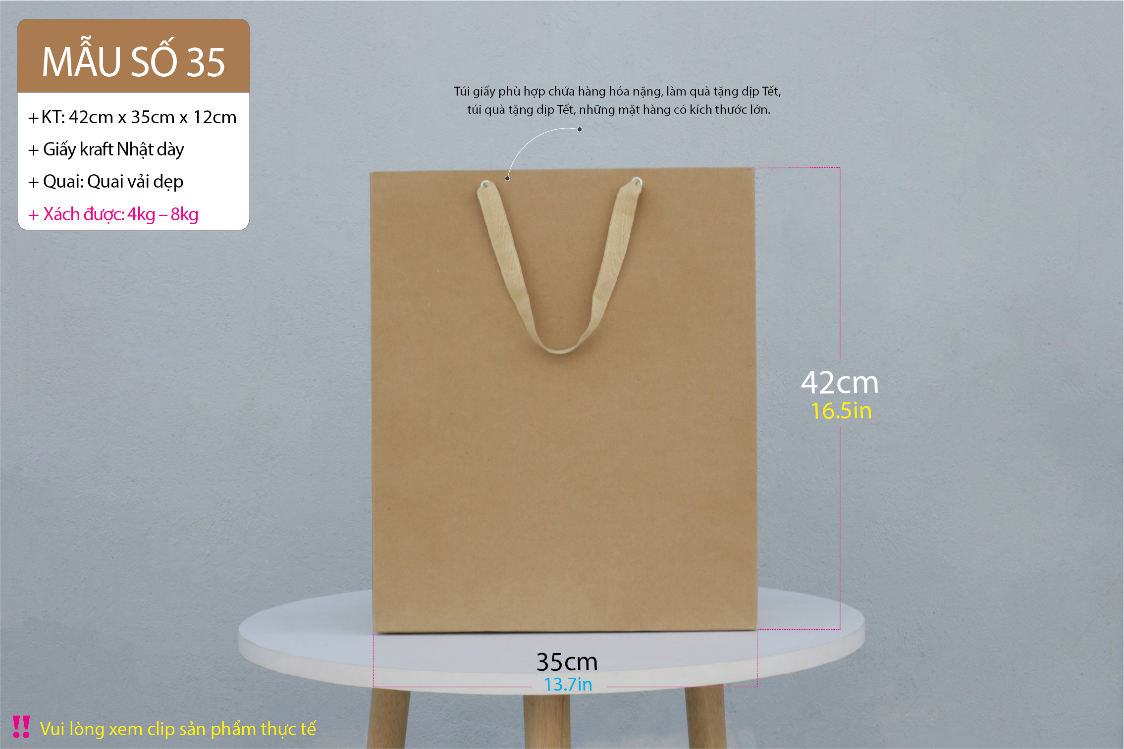 Túi giấy kraft với quai cầm chắc chắn có nhiều kích thước khác nhau, phù hợp cho mọi loại quà. Bên cạnh đó, bạn cũng có thể chọn túi giấy xi măng hoặc những mẫu túi đựng quà tặng cao cấp như HAPAS. Đặc biệt, chúng tôi cung cấp combo 05 túi giấy kraft để bạn dễ dàng lựa chọn và tiết kiệm chi phí.