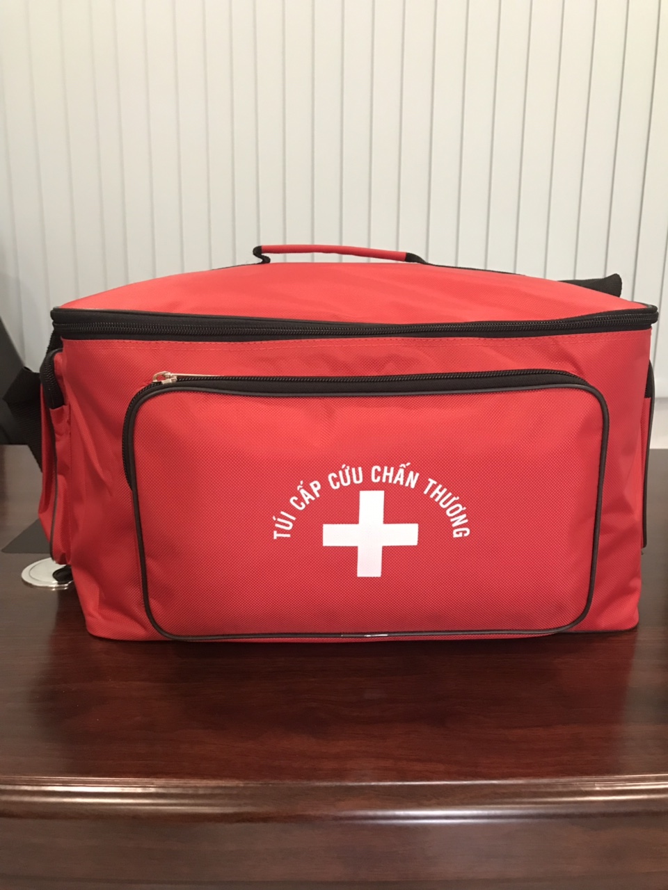 Điểm nổi bật của túi là biểu tượng chữ thập đỏ trên nền trắng, giúp mọi người dễ dàng nhận diện trong những tình huống khẩn cấp. Túi được làm từ chất liệu bền, chịu được mài mòn và ít bám bụi, rất thuận tiện khi vệ sinh. Những sản phẩm bên trong như bông băng, gạc, thuốc sát khuẩn và các dụng cụ khác được trang bị đầy đủ để xử lý các vết thương thông thường như cắt, xước hay bỏng.