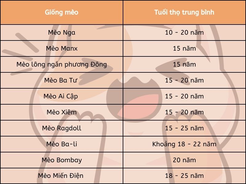 Mèo cái thường thọ hơn mèo đực khoảng 1-2 năm, và những chú được tiêm phòng đầy đủ có thể sống thêm nhờ sức đề kháng tốt. Kỷ lục thế giới là 32-38 năm, nhưng hiếm lắm, chỉ khi chăm sóc cực kỳ chu đáo.