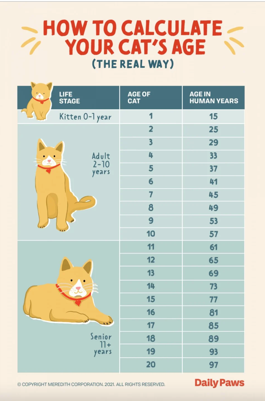 Sang năm thứ hai, mèo đã như chàng trai hay cô gái 24 tuổi, bước vào tuổi teen đầy năng lượng. Từ năm thứ ba trở đi, cứ mỗi năm mèo thêm khoảng 4 tuổi người. Ví dụ, mèo 5 tuổi bằng 36 tuổi ta, còn 10 tuổi thì như ông bà 56 tuổi rồi đấy.