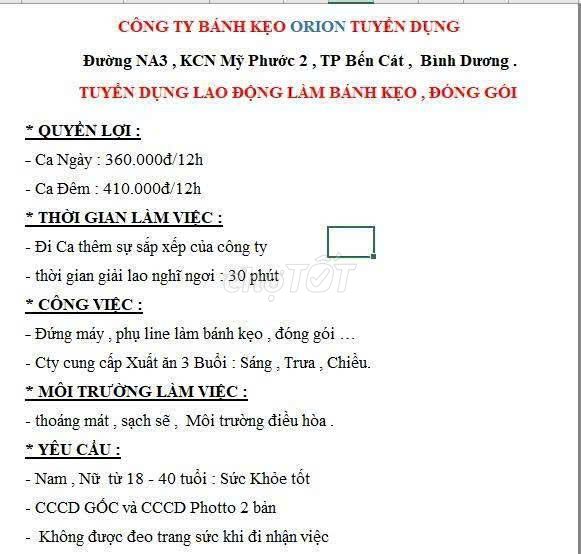 Trong bối cảnh ngành công nghiệp thực phẩm đang phát triển mạnh mẽ, nhu cầu tuyển dụng công nhân đóng gói bánh kẹo tại Bình Dương ngày càng gia tăng. Với mức lương hấp dẫn, môi trường làm việc thân thiện cùng các chế độ phúc lợi đầy đủ, đây là cơ hội lý tưởng cho những ai muốn tìm kiếm việc làm ổn định. Hãy nhanh tay ứng tuyển để trở thành một phần của đội ngũ sản xuất chuyên nghiệp, đóng góp vào sự phát triển của ngành công nghiệp bánh kẹo và xây dựng tương lai vững chắc cho chính mình.