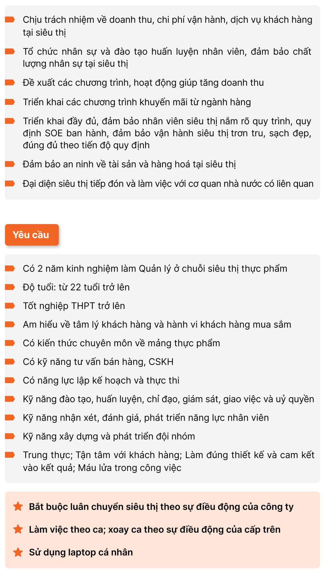 Bên cạnh kiến thức chuyên môn, quản lý siêu thị còn cần có các kỹ năng mềm như giao tiếp và đàm phán hiệu quả. Để có thể quản lý tốt, ứng viên cần có ít nhất 3 năm kinh nghiệm, trong đó có thời gian đảm nhiệm vị trí quản lý tương đương. Họ cũng phải nắm rõ nội quy, quy định của siêu thị và có khả năng tối ưu hóa chi phí trong quá trình vận hành.