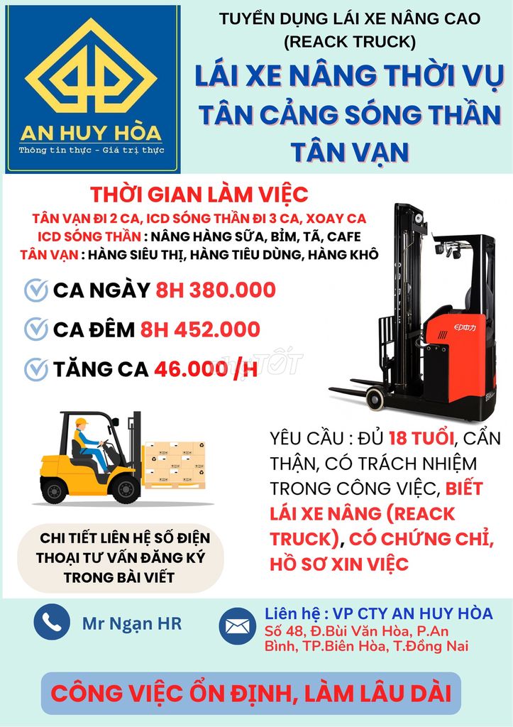 Ngoài mức lương cạnh tranh, nhiều công ty còn cung cấp các chế độ phúc lợi tốt như bảo hiểm xã hội, nghỉ phép và thời gian làm việc linh hoạt. Nếu bạn đang tìm kiếm việc làm trong lĩnh vực lái xe nâng, đây chính là thời điểm thuận lợi để nắm bắt cơ hội. Hãy nhanh tay ứng tuyển để không bỏ lỡ những công việc hấp dẫn tại Bình Dương!