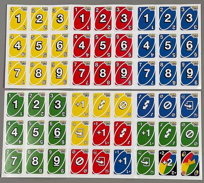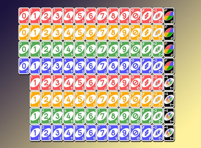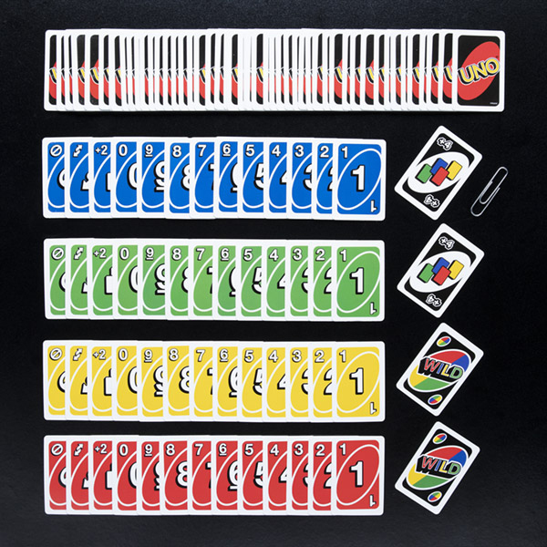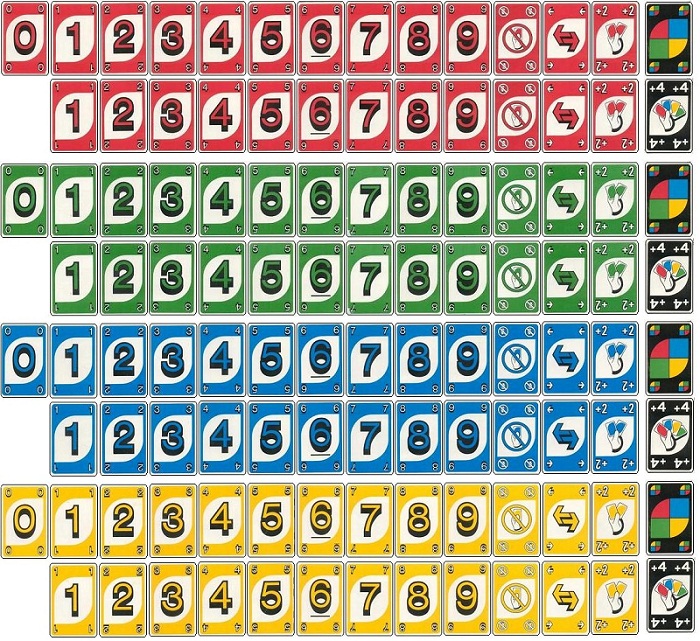 Cụ thể, trong bộ bài này có 76 lá bài số, bao gồm 19 lá mỗi màu cho các số từ 1 đến 9 và một lá số 0 duy nhất cho mỗi màu. Ngoài ra, bộ bài còn có 32 lá bài đặc biệt, trong đó có những lá với chức năng thay đổi lượt chơi, như “Skip” và “Reverse”, cùng với 8 lá bài “Wild” cho phép người chơi thay đổi màu ngẫu nhiên.