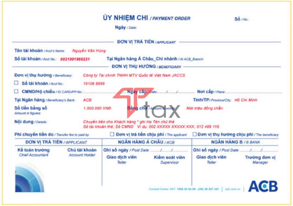Bên cạnh đó, bạn cũng cần ghi rõ số tiền bằng số và bằng chữ để đảm bảo tính minh bạch và chính xác của giao dịch. Mẫu ủy nhiệm chi của ACB rất dễ sử dụng, bạn có thể thực hiện tại quầy giao dịch hoặc thông qua trang web của ngân hàng.
