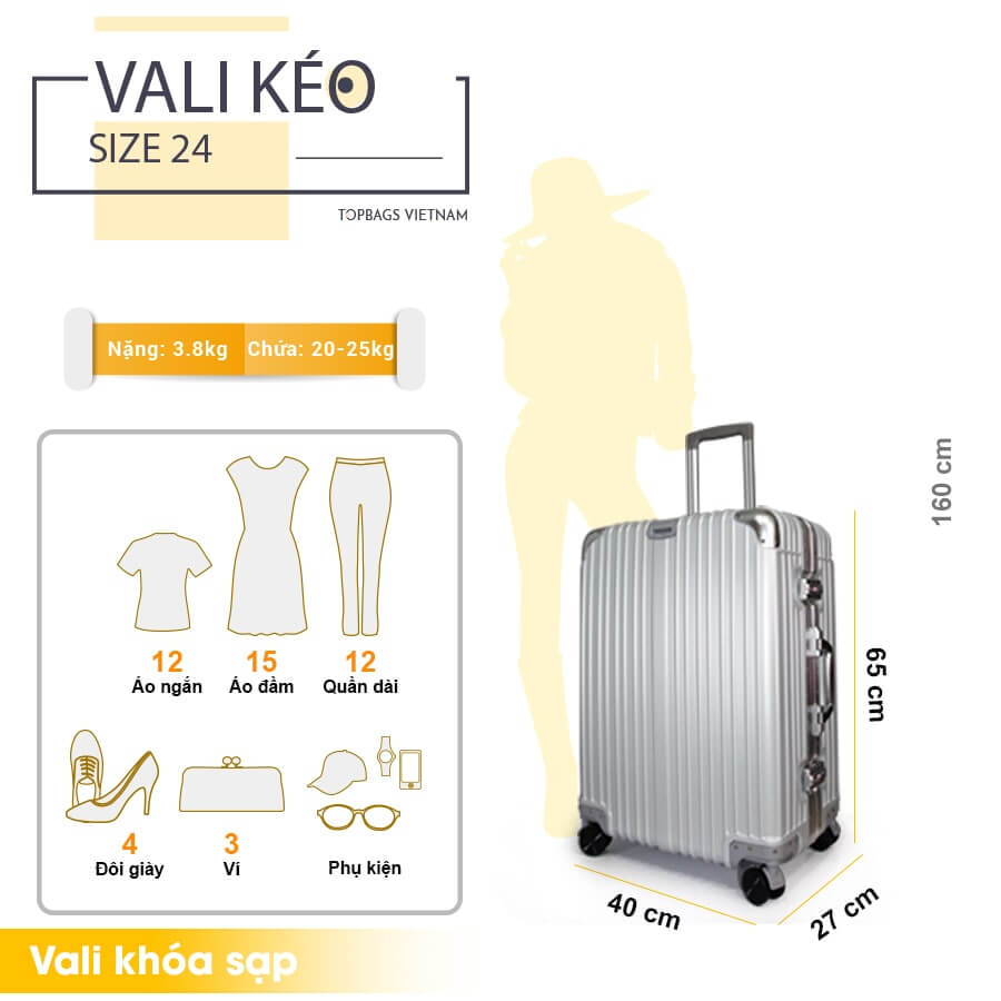 Khi chuẩn bị cho những chuyến đi xa, việc lựa chọn vali với kích thước phù hợp luôn là mối quan tâm hàng đầu của nhiều người. Trong số các loại vali hiện nay, vali size 24 inch được ưa chuộng nhờ khả năng chứa đựng vừa đủ tư trang cho các chuyến công tác hay du lịch ngắn ngày. Tuy nhiên, không phải ai cũng hiểu rõ về kích thước, trọng lượng và quy định vận chuyển của loại vali này. Bài viết dưới đây sẽ giúp bạn giải đáp chi tiết về kích thước, số cân nặng tối đa, cũng như hướng dẫn sử dụng vali 24 inch một cách hiệu quả nhất.