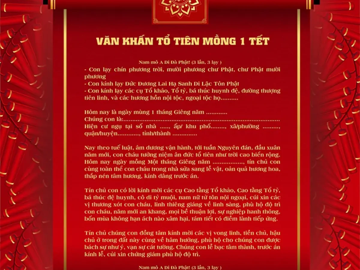 Trong văn hóa truyền thống của người Việt, ngày mùng 1 Tết có ý nghĩa vô cùng thiêng liêng và quan trọng. Đây là thời khắc chuyển giao giữa năm cũ và năm mới, là dịp để mọi người bày tỏ lòng thành kính với tổ tiên, thần linh cũng như cầu mong một năm mới an lành, may mắn. Để nghi lễ cúng đầu năm được diễn ra trang trọng, việc chuẩn bị bài văn khấn mùng 1 Tết đúng chuẩn là điều không thể thiếu. Dưới đây là các mẫu văn khấn, bài cúng mùng 1 Tết năm 2021 đầy đủ và chi tiết, giúp các gia đình thực hiện nghi lễ đầu năm một cách trọn vẹn nhất.