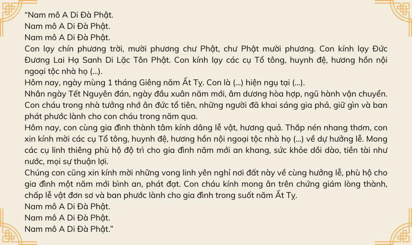 Khi khấn vái, nên đọc rõ ràng, trang nghiêm những câu như: “Con xin kính lạy Đức Đương Lai Hạ Sinh Di Lặc Tôn Phật”, trước khi cầu xin các ngài ban cho gia đình một năm mới nhiều may mắn và bình an. Đừng quên ghi rõ thông tin gia đình bạn, như tên và địa chỉ, để các vị thần linh nhận biết và phù trì.