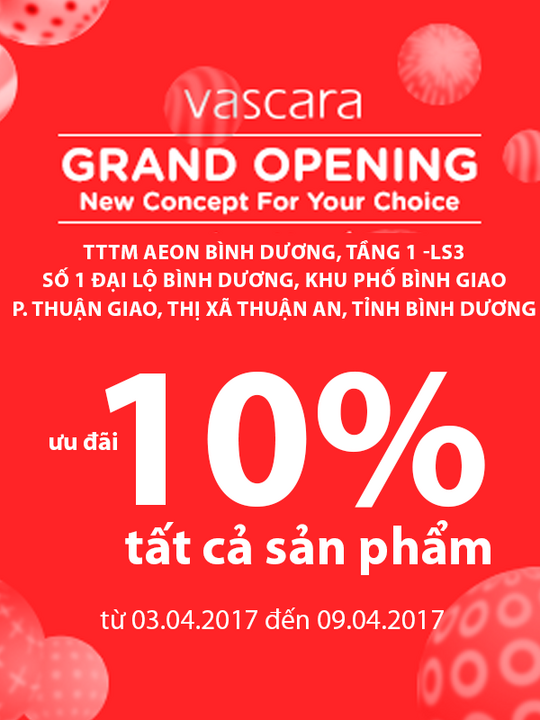 Chương trình khuyến mãi diễn ra từ ngày 11 đến 20 tháng 10, bên cạnh đó, nhiều sản phẩm khác cũng được giảm giá từ 20-40%. Hãy đến ngay Vascara tại tầng 1, LS3, 1 Đại lộ Bình Dương, P. Thuận Giao, Thị xã Thuận An, Bình Dương để không bỏ lỡ cơ hội mua sắm tuyệt vời này nhé!