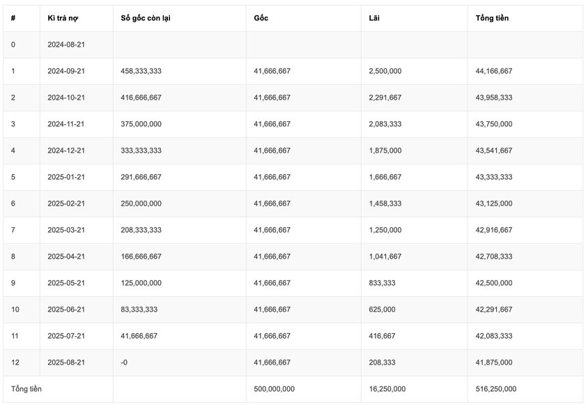 Thêm vào đó, bạn sẽ phải trả một khoản gốc cố định hàng tháng, trong trường hợp này là 5 triệu đồng. Vì vậy, tổng số tiền bạn cần thanh toán hàng tháng sẽ là 6,375 triệu đồng, bao gồm cả gốc và lãi. Đây là một chi phí không nhỏ, nhưng nếu bạn có kế hoạch tài chính hợp lý, việc chi trả sẽ trở nên dễ dàng hơn.
