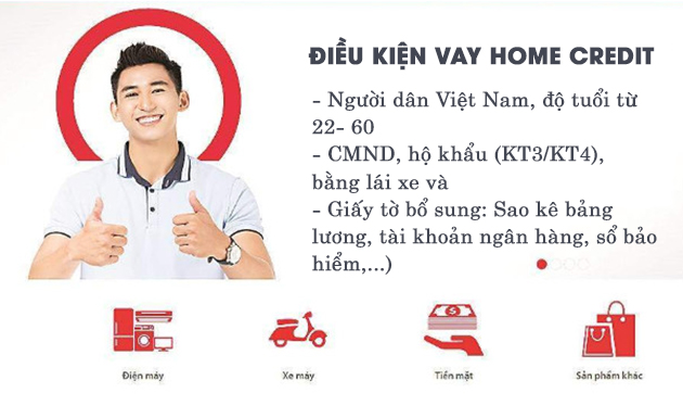 Điều kiện để vay tiền khá dễ dàng, bạn chỉ cần là công dân Việt Nam từ 20 đến 60 tuổi và có giấy tờ tùy thân còn hiệu lực. Bên cạnh đó, bạn cũng có thể vay trực tiếp tại các chi nhánh Home Credit nếu muốn gặp gỡ nhân viên tư vấn.
