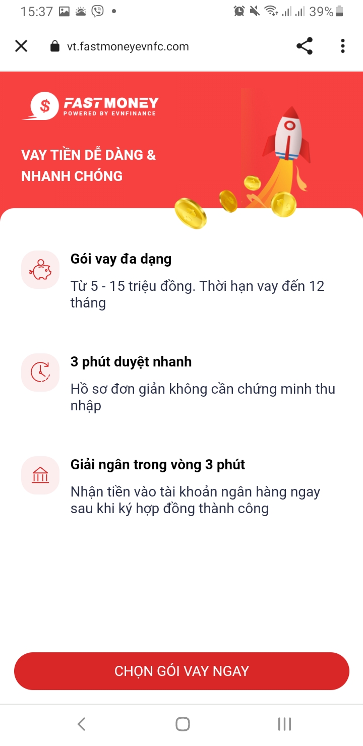 Vay nhanh Fast Money là giải pháp vay tiền trực tuyến nhanh chóng, cho phép bạn vay lên đến 20 triệu đồng chỉ với giấy tờ tùy thân như CMND. Không cần phải gặp mặt hay cung cấp tài sản thế chấp, quy trình xét duyệt hoàn toàn diễn ra trực tuyến và chỉ mất khoảng 5 phút để hoàn tất. Dịch vụ này hoạt động liên tục 24/7, đáp ứng kịp thời nhu cầu tài chính cấp bách của mọi người.