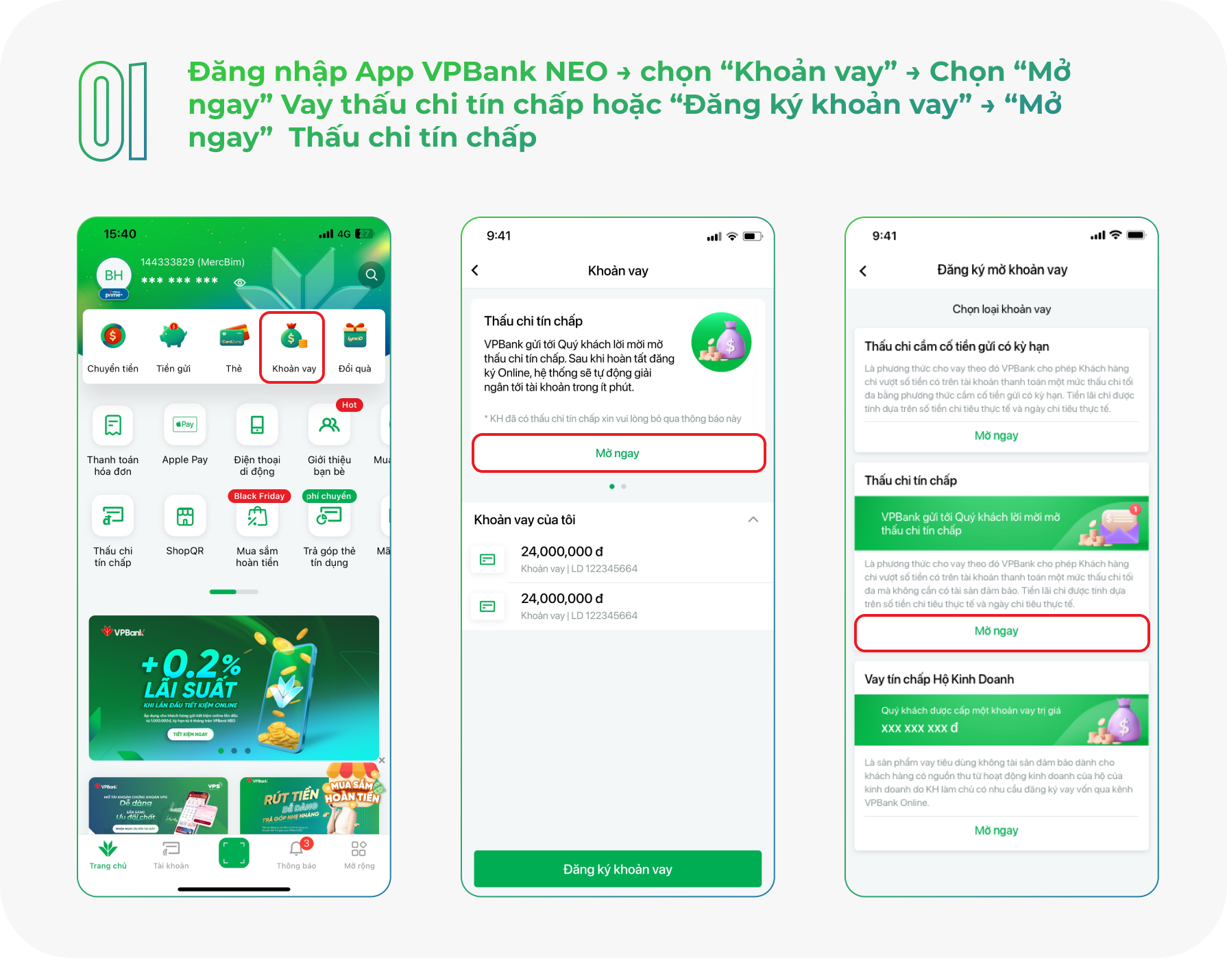 Để mở khoản vay thấu chi tại VPBank, bạn chỉ cần thực hiện các bước đơn giản trên ứng dụng ngân hàng. Việc này không chỉ tiết kiệm thời gian mà còn giúp bạn xử lý các vấn đề tài chính một cách nhanh chóng và hiệu quả.