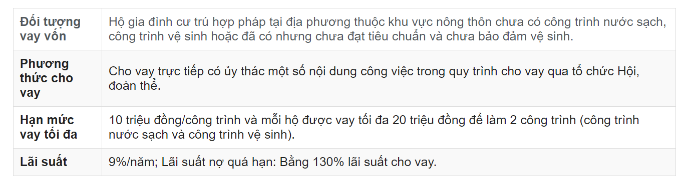Chương trình vay vốn này hướng đến những hộ dân ở những khu vực nông thôn chưa có công trình nước sạch, hoặc các công trình hiện có đã bị hư hỏng, không đáp ứng đủ nhu cầu sử dụng. Nhằm khuyến khích các hộ gia đình đầu tư vào việc xây dựng hệ thống nước sạch, mỗi hộ có thể vay tối đa 50 triệu đồng cho hai loại công trình: nước sạch và vệ sinh.