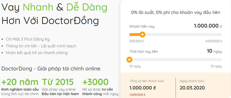 Doctor Đồng là một dịch vụ vay tiền online rất được nhiều người tin tưởng hiện nay tại Việt Nam. Điều khiến mình ấn tượng nhất là thủ tục vay cực kỳ đơn giản, chỉ cần CMND hoặc CCCD là bạn có thể đăng ký ngay mà không cần phải gặp mặt hay chứng minh tài sản gì cả. Đặc biệt, nếu bạn vay lần đầu, sẽ được hưởng ưu đãi 0% lãi suất, rất phù hợp cho những ai cần tiền gấp mà không muốn mất thêm chi phí phát sinh.