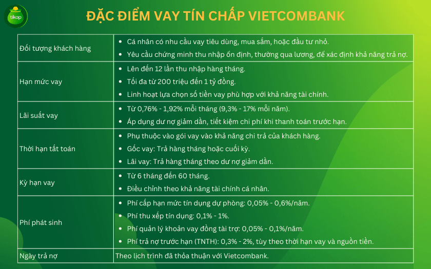 Không chỉ dừng lại ở đó, Vietcombank còn cung cấp gói vay tín chấp theo lương với lãi suất chỉ từ 0.85% – 1.3%/tháng, cho phép bạn vay từ 25 triệu đến 500 triệu đồng trong thời gian từ 1 đến 5 năm mà không cần chứng minh thu nhập. Đây thực sự là những chương trình hỗ trợ tài chính lý tưởng để bạn có thể thực hiện các dự định của mình một cách dễ dàng hơn.